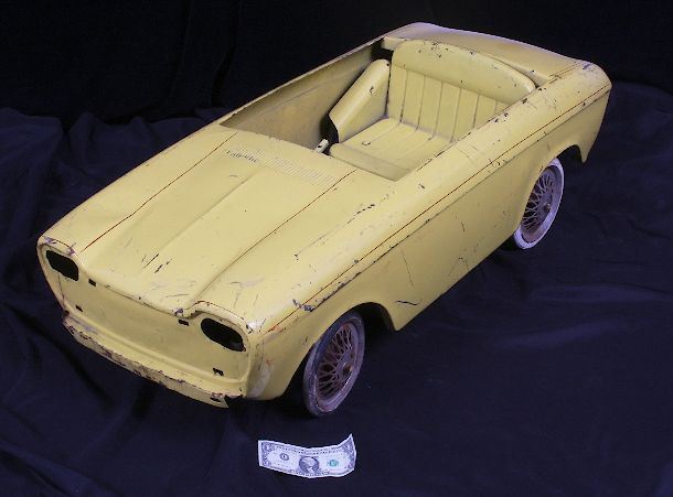 Antique Vintage Yellow Pedal Car c.1930-50's. Awesome Collector's Item. As-Is Condition. Measures 45" long, 20" wide and weighs 25lbs. Dollar bill in photo is to demonstrate size of the pedal car, it is not included.