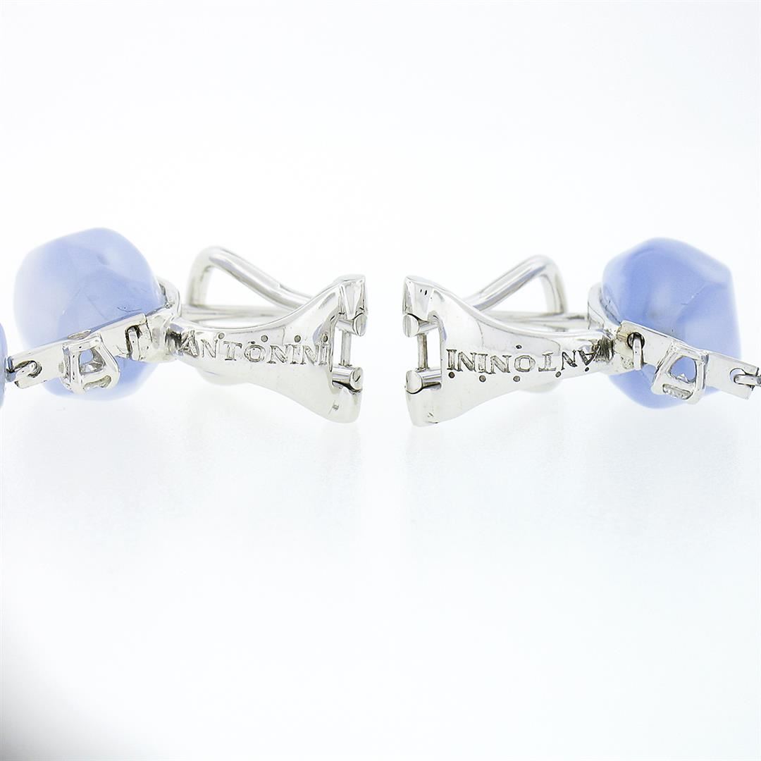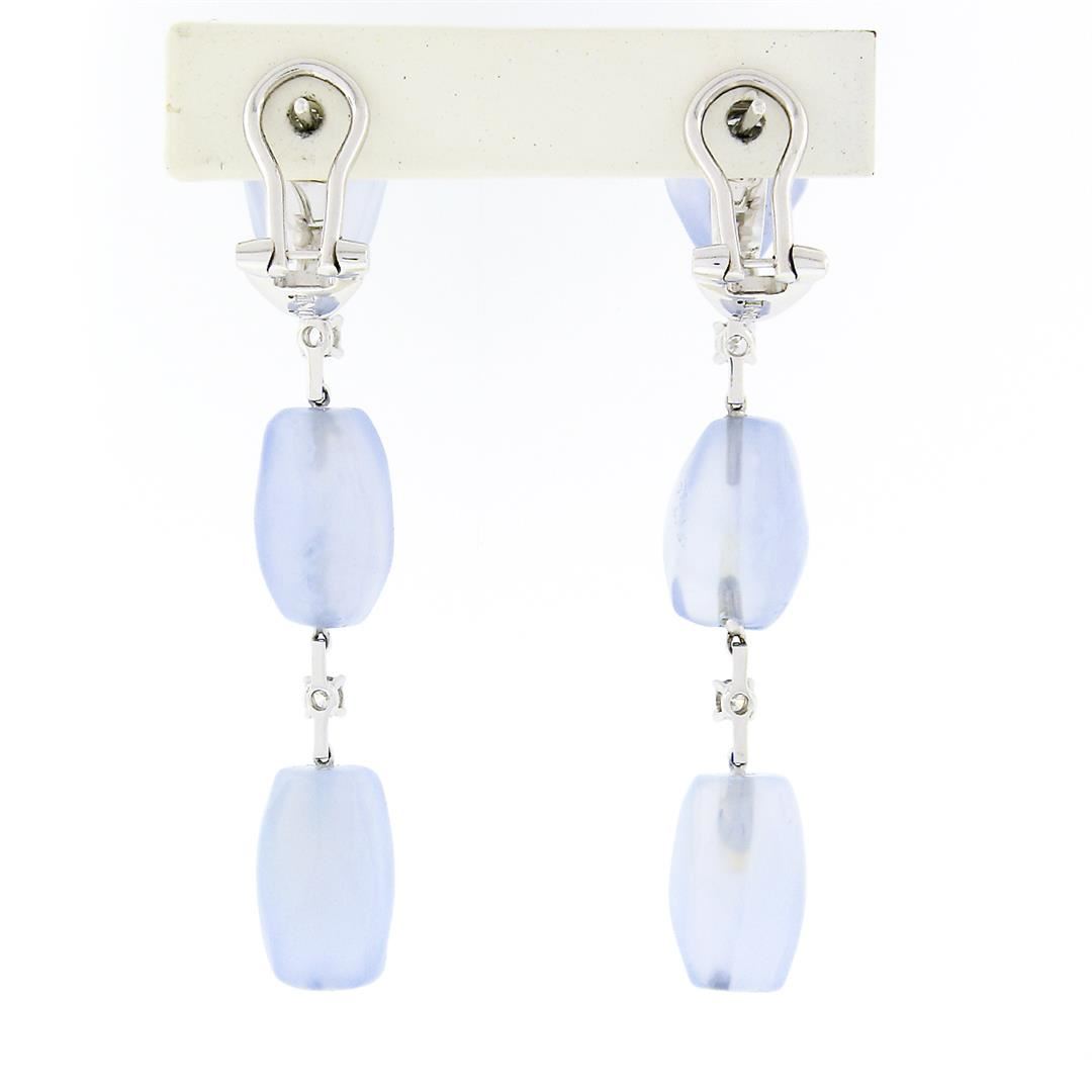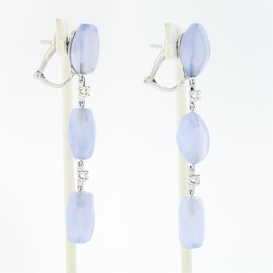 A solid 18k white gold long dangle drop earrings by Antonini, featuring 6 freeform faceted bead cabochon cut natural chalcedony (14.1x9.5mm), and 4 round brilliant cut natural diamonds (G/H - VS1/VS2 ; 0.15ctw). The earrings height measure approximately 61.80mm and weigh a total of 15.10 grams.
