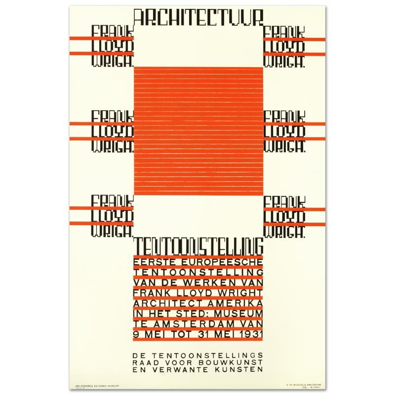 "Architectuur, F.L. Wright" is a hand pulled lithograph on paper by the RE Society, image originally by Hendrikus T. Wijdeveld. Includes letter of authenticity. Measures approx. 20" x 29.5" (image).