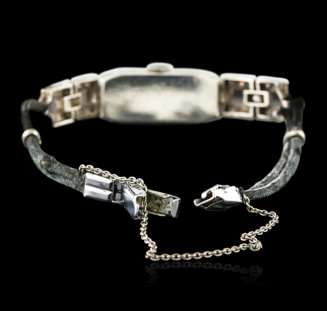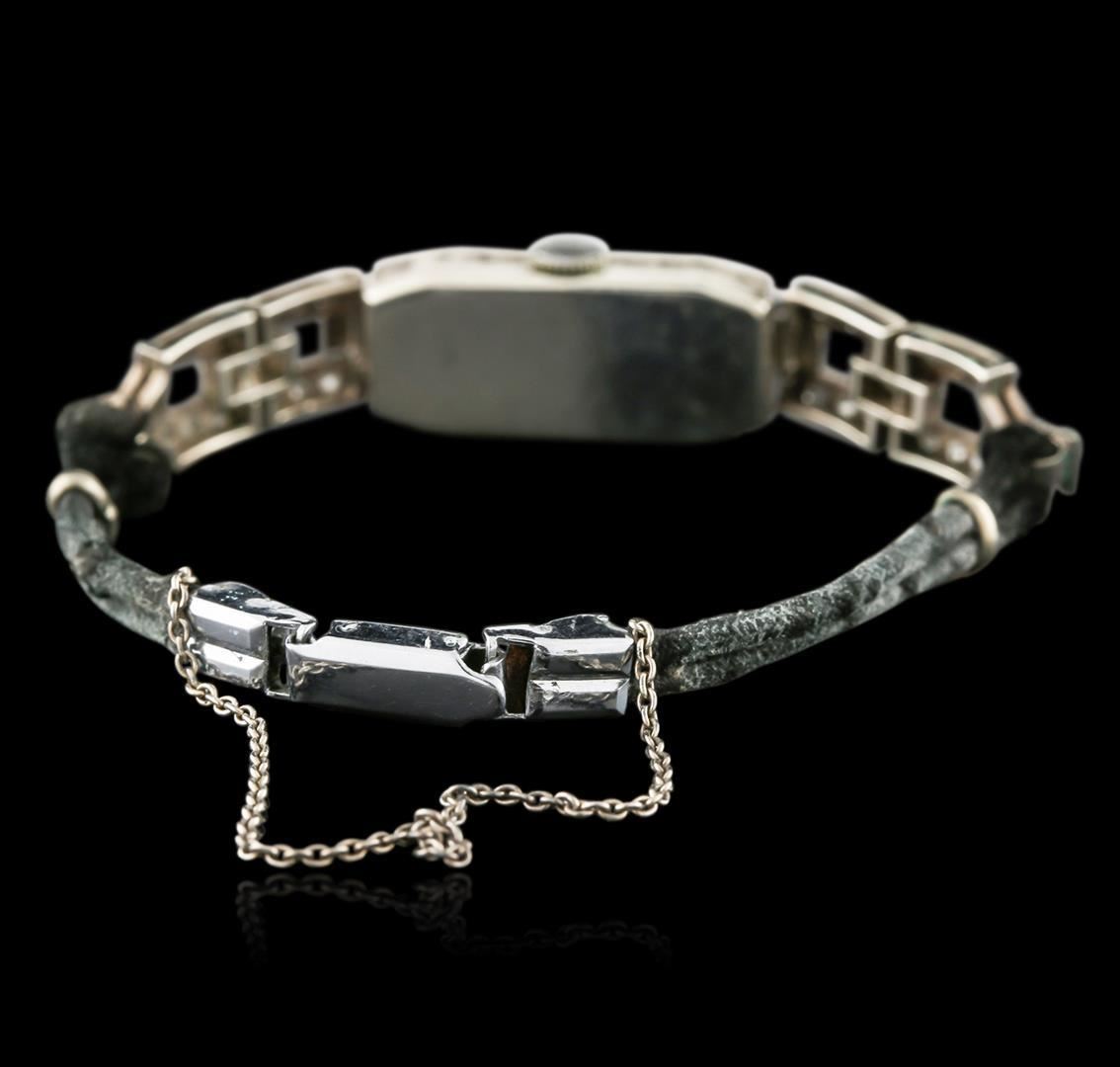 One ladies, vintage "Art Deco" style wristwatch electronically tested 14KT white gold, Case: 25 x 11mm with a hinged back, Case Back: space available for engraving, Flexible Case Lugs: set throughout with diamonds, Case Lug Terminals: set with diamonds, Crown: scalloped edge, Bezel: diamond set, Crystal: acrylic. Swiss Movement: Fifteen jewel mechanical stem wind, Signed Dial: Mu Du, Light Ivory color, pointed hands, indices, and numerals, Bracelet: Black double cord, Condition: G-5 Fine. Six inch length, adjustable. Containing: Forty-six prong set rose cut diamonds, approximate total weight of 46 Stones = 0.40 ct. Cutting style circa early 19th century. Graded in the setting. Clarity: SI-2 to I-2 Average. Color: G - I. Total Weight of Diamonds: 0.40ct. Total Weight of Watch: 13.23 grams. AIG Appraised.