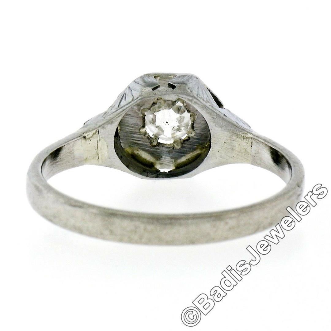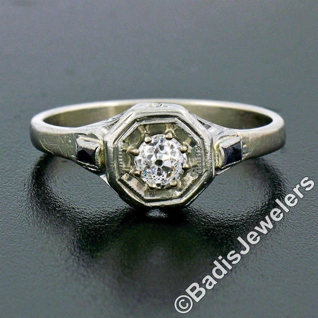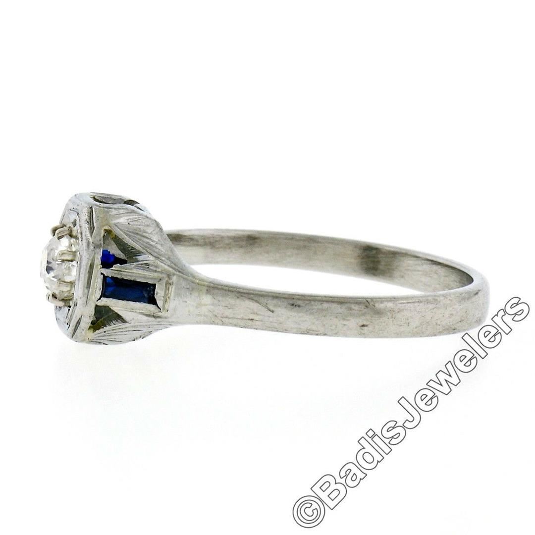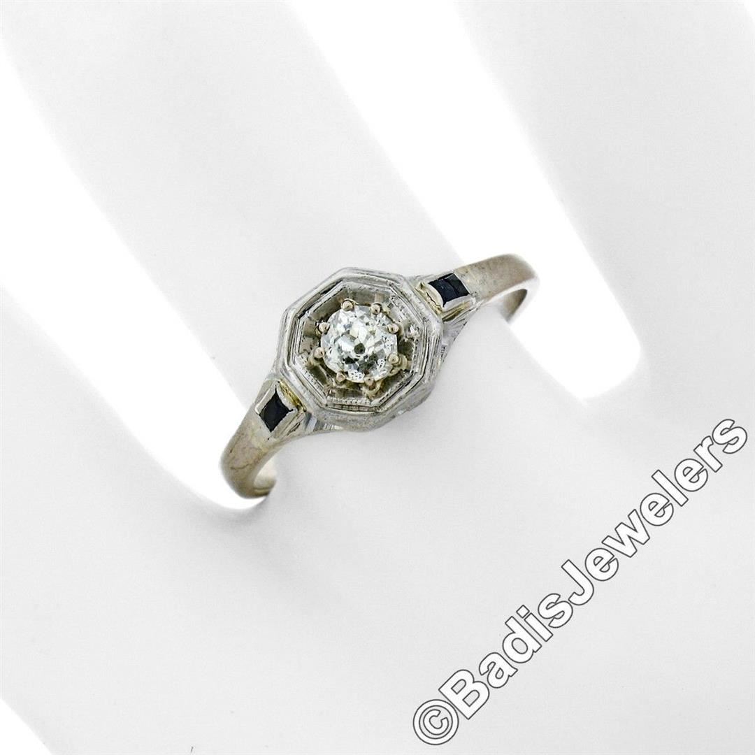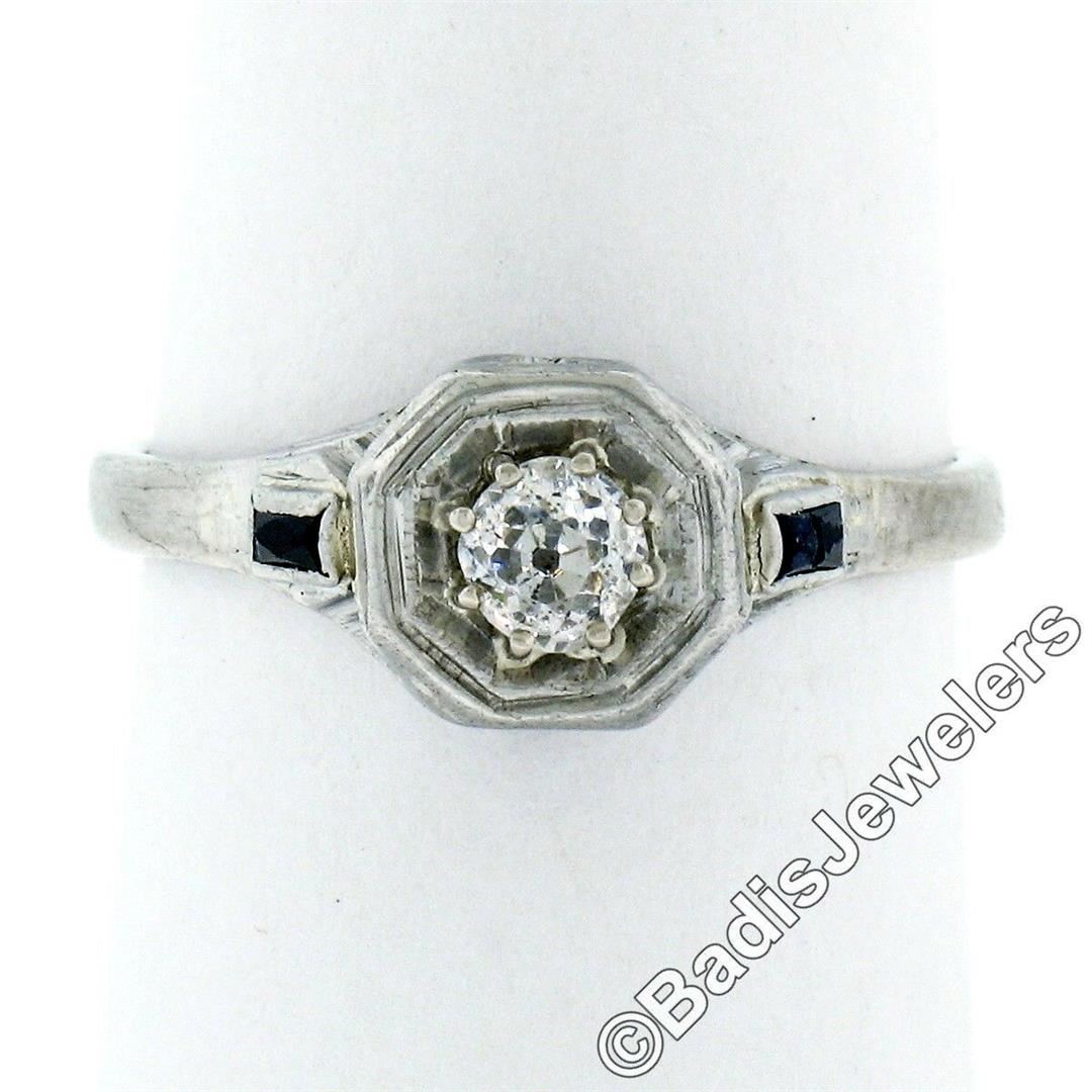 An art deco period 14kt white gold ring featuring a 0.28ct old European cut diamond (G - SI1) bead set at its center flanked by 2 synthetic sapphires. The ring is size 7.0, weighs a total of 2.69 grams, and measures 7.5mm wide.