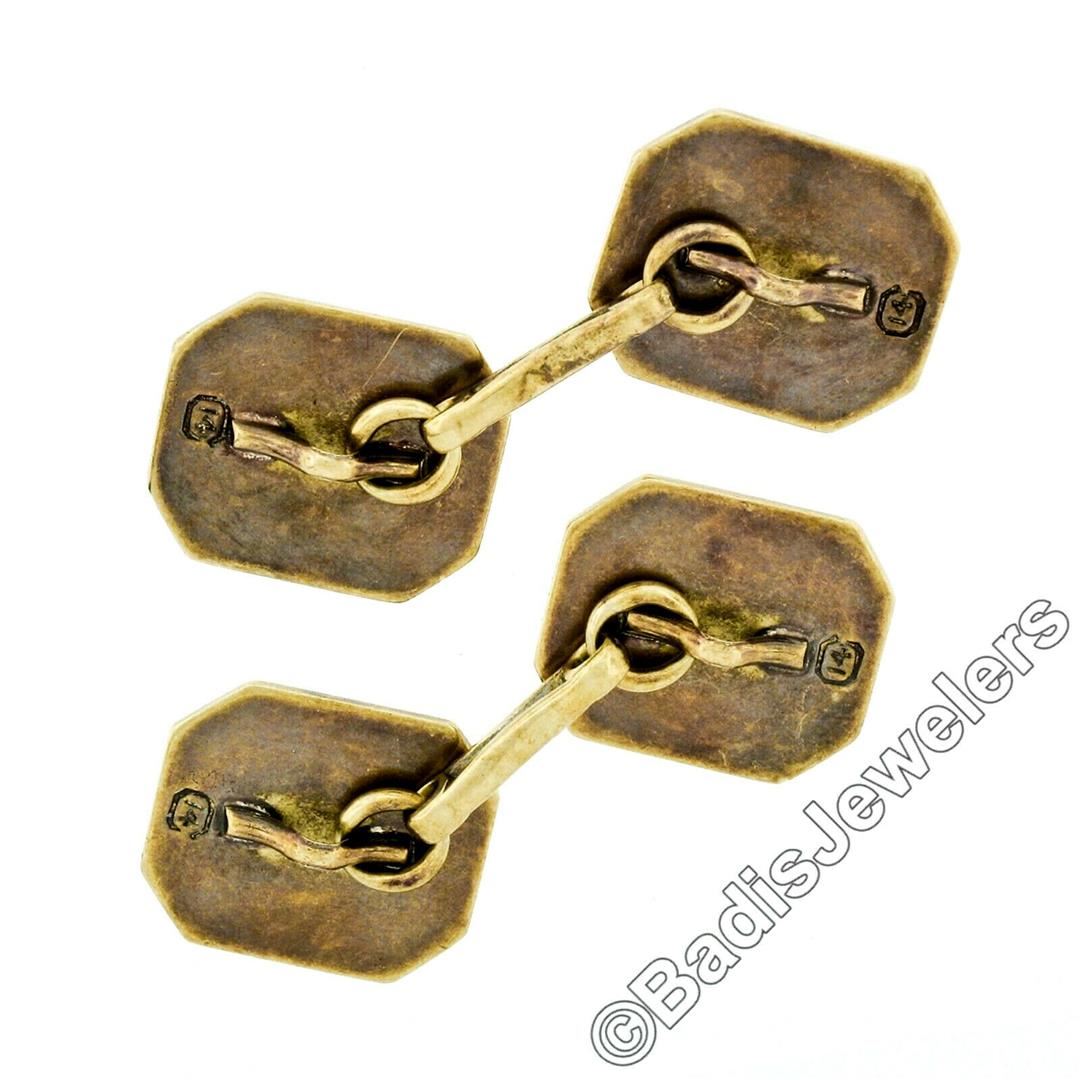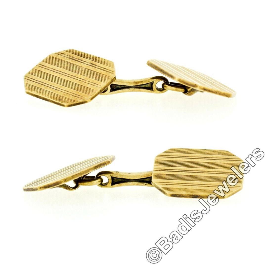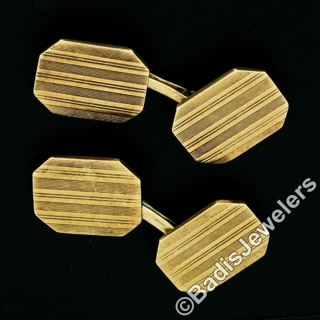 14kt yellow gold art deco period cuff links with a fine grooved pattern.These cuff links have a dual panel design with a clearence of 21.85mm, weigh a total of 9.22 grams, and the front panels measure 14.25x12.00mm.