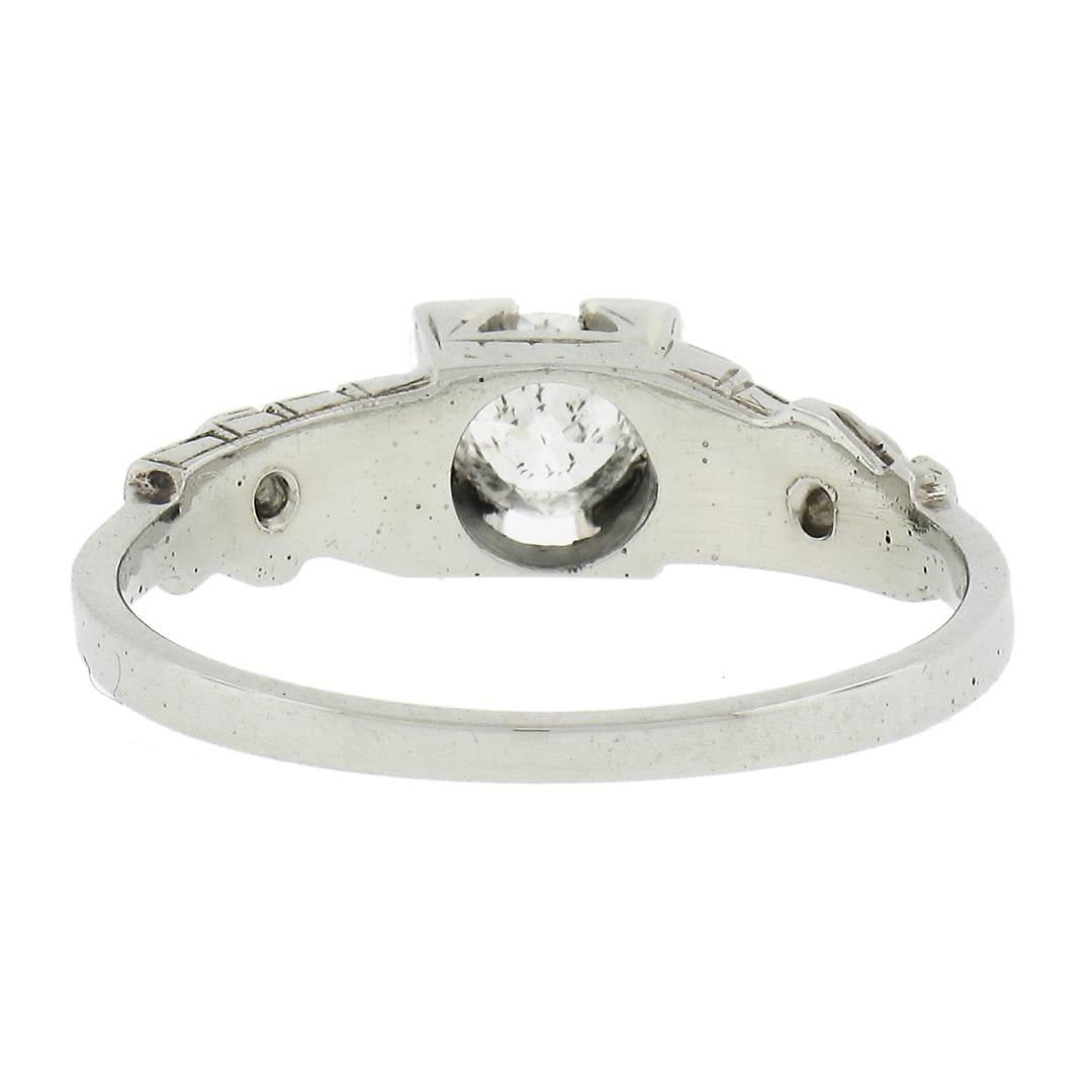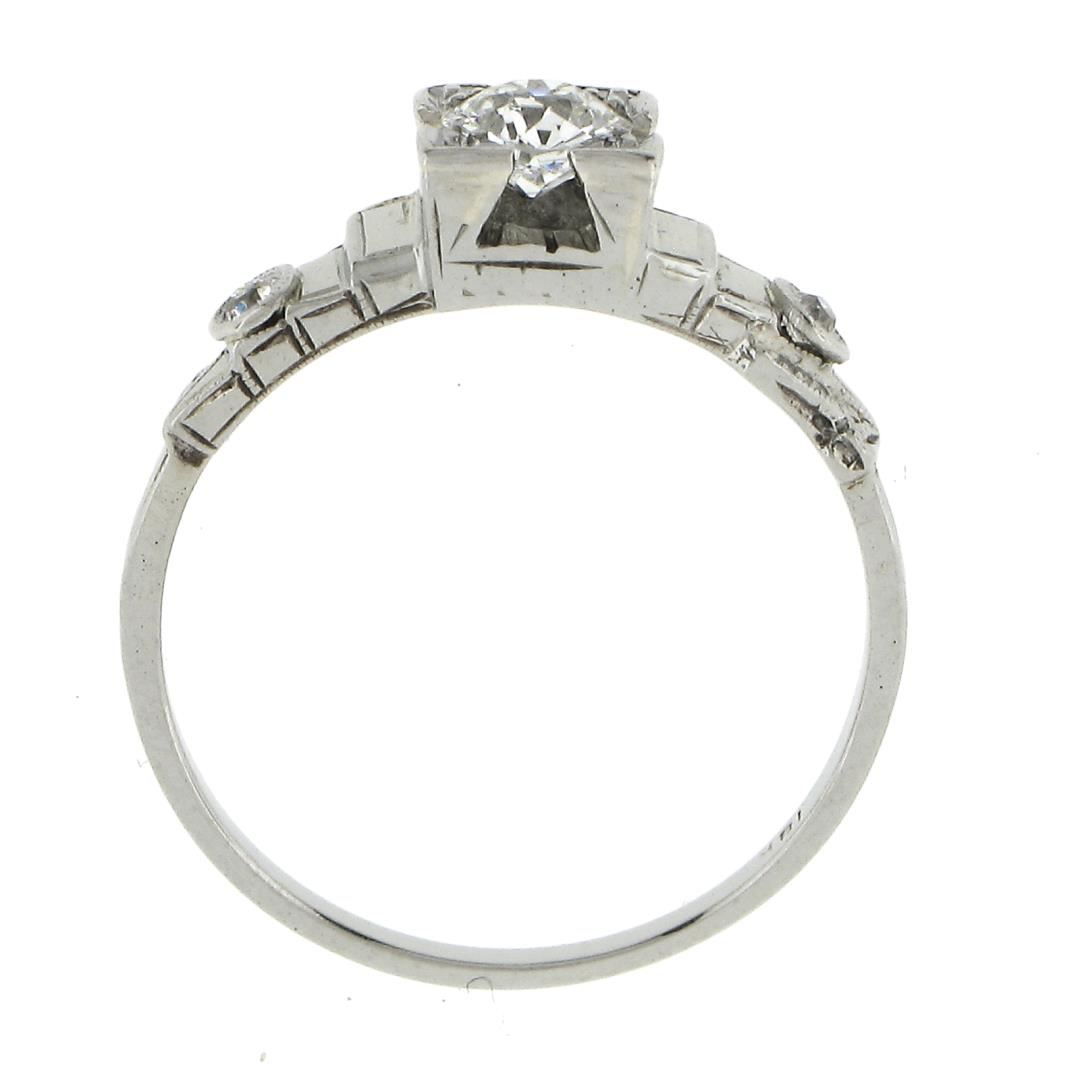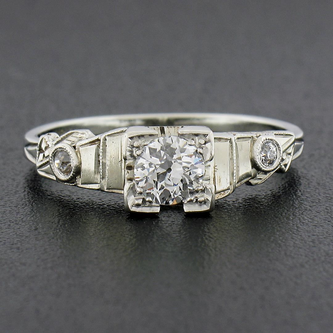 An antique solid 18k white gold engagement ring, with 1 old european cut natural diamond (G - SI1 ; 0.36ct), and 2 old european cut natural diamonds (G - SI1 ; 0.04ctw). The ring is size 6.5, weighs a total of 2.66 grams, and measures 5.7mm wide.