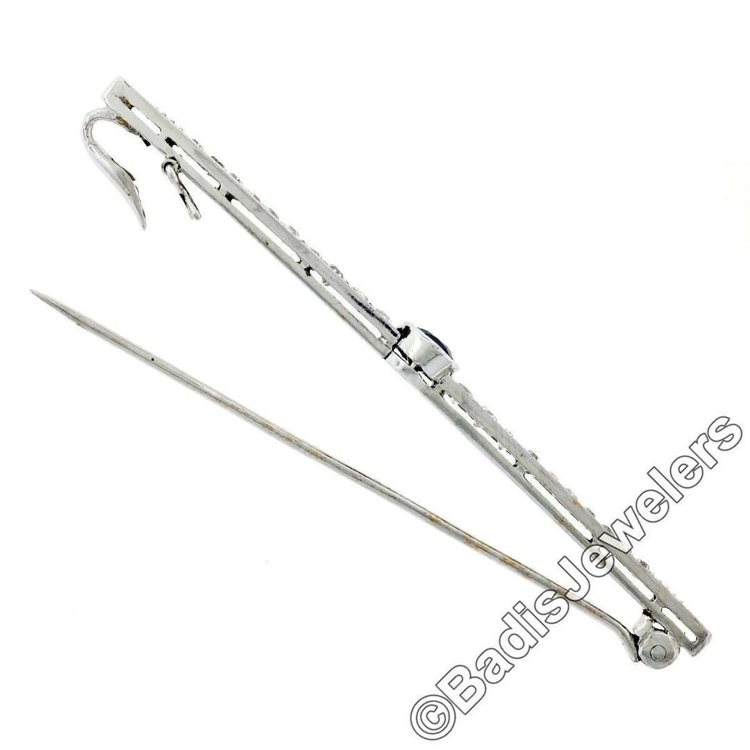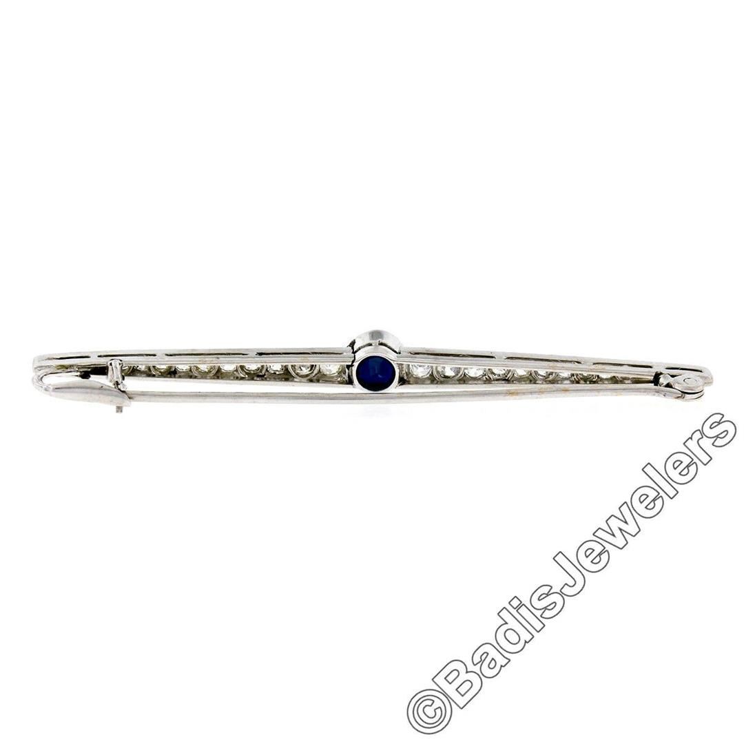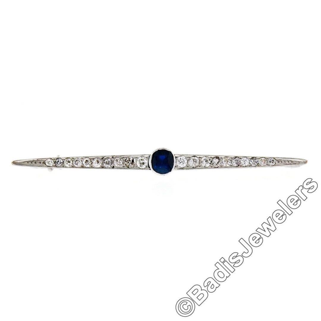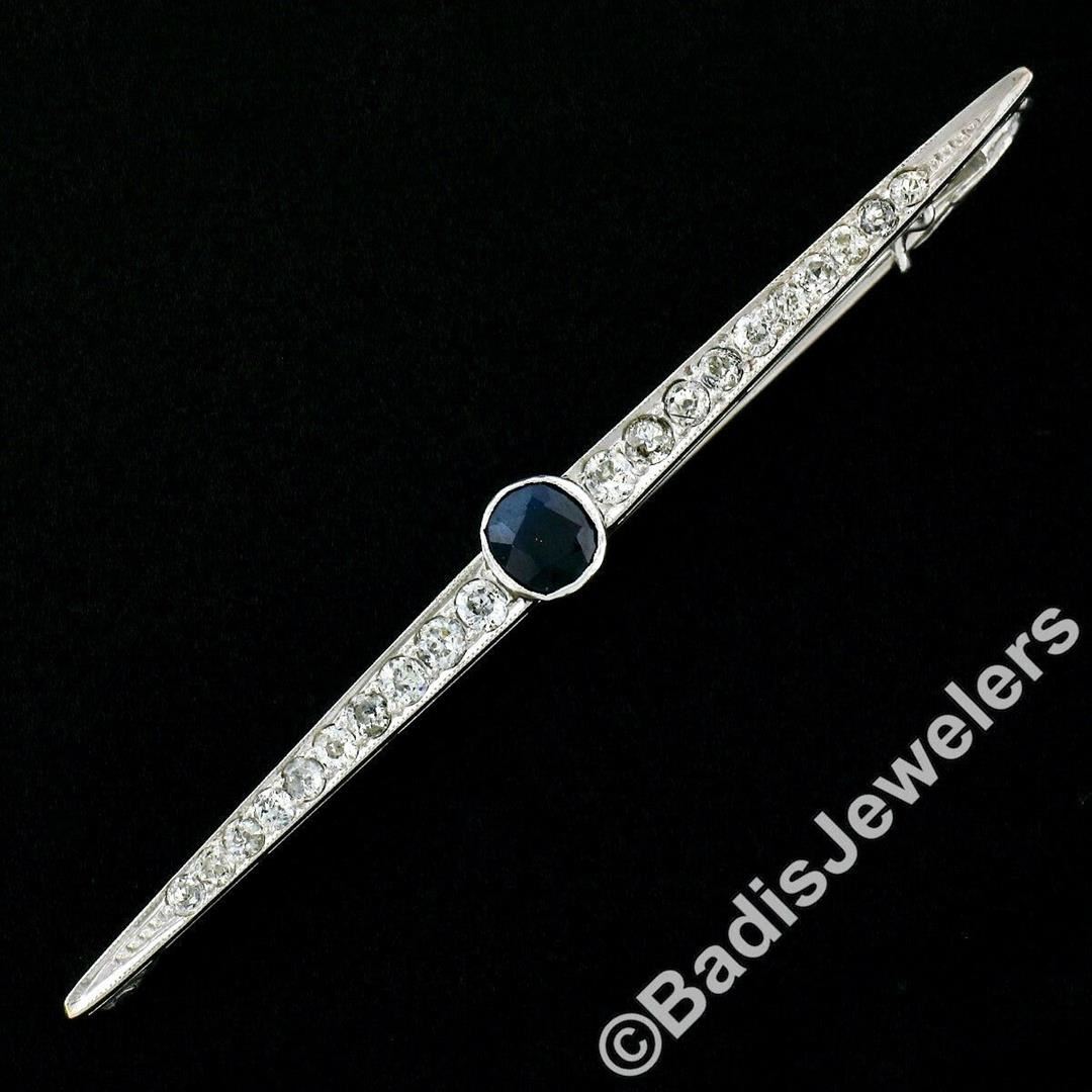 An 18kt white gold art deco period bar pin featuring a 1.00ct cushion cut sapphire bezel set at the center of 1.05ctw of old mine cut diamonds (G to I - VS2 to SI2). Measures 67.59x6.4mm and weighs a total of 4.54 grams.