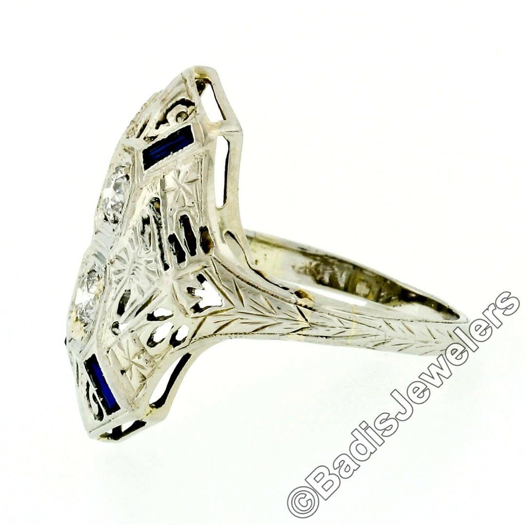 An 18kt white gold art deco period filigree dinner ring with 2 old European cut diamonds (G/H - VS2/SI1; 0.22ctw) and synthetic baguette French cut sapphires. The ring is size 6, weighs a total of 3.12 grams, and measures 20.80mm wide.