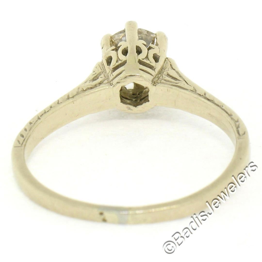 An art deco period 14kt white gold 0.60ct European cut diamond (H - SI1) solitaire engagement ring. The ring is size 6.0, weighs a total of 2.33 grams, and measures 6.5mm wide.