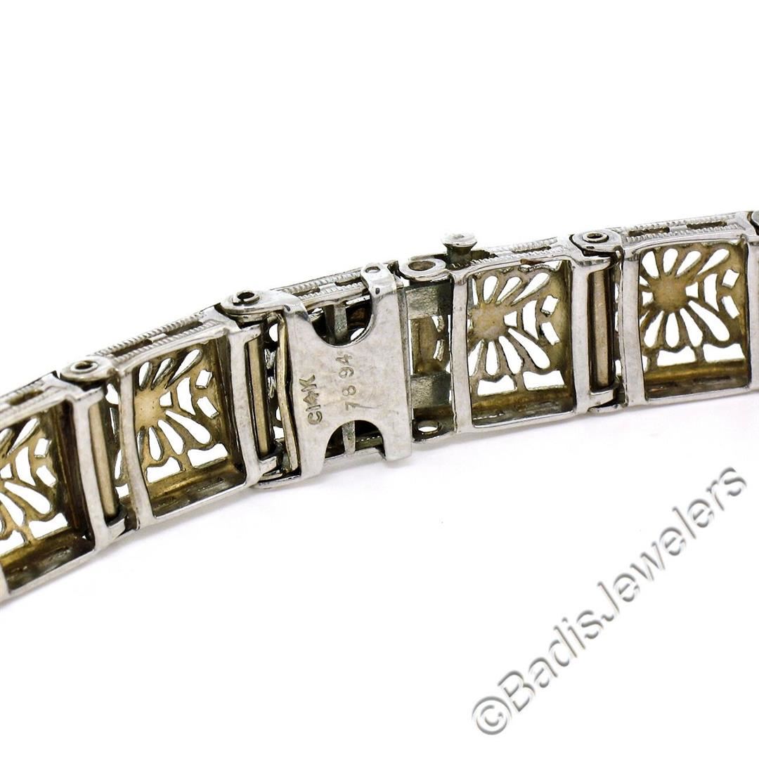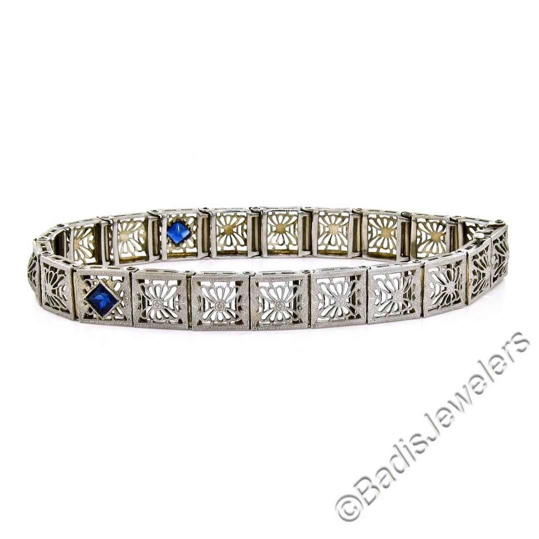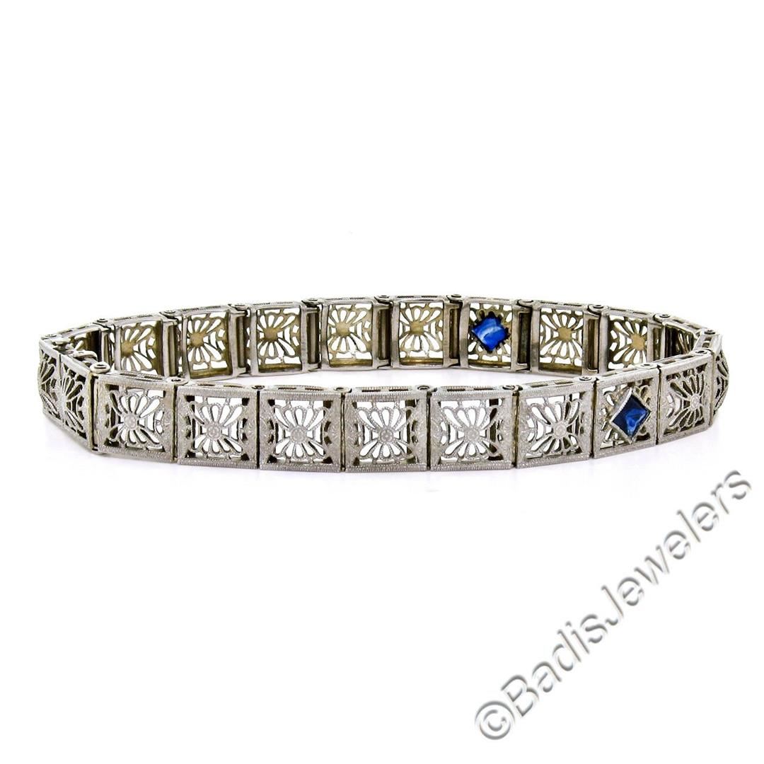 An art deco period etched 14kt white gold etched line filigree bracelet with an 8pt old European cut diamond (F - VS2) and 2 square French cut synthetic sapphires. It weighs a total of 14.3 grams, measures 8.9mm wide, and measures 7 inches in length.