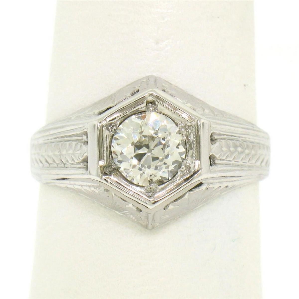 One Art Deco Etched Unisex 18k White Gold 0.85ct European Cut Diamond Solitaire Ring. Item Details: Material: 18k Solid White Gold, Weight: 3.8 Grams, Stone(s): (1) Natural Genuine Diamond - Round European Cut - Prong Set - H Color - VS1 Clarity, Total Carat Weight: 0.85 (approx.), Ring Size: 7.75 (We can custom size this ring.), Ring Width: 12.27mm, Ring Height: 5.32mm rise off the finger, Condition: Antique, Art Deco period piece. Excellent condition!