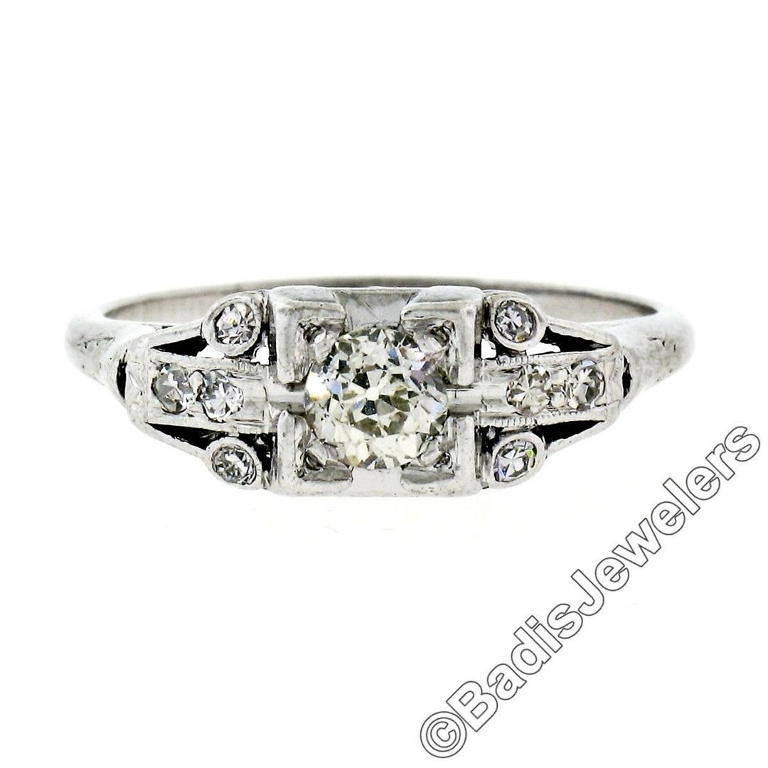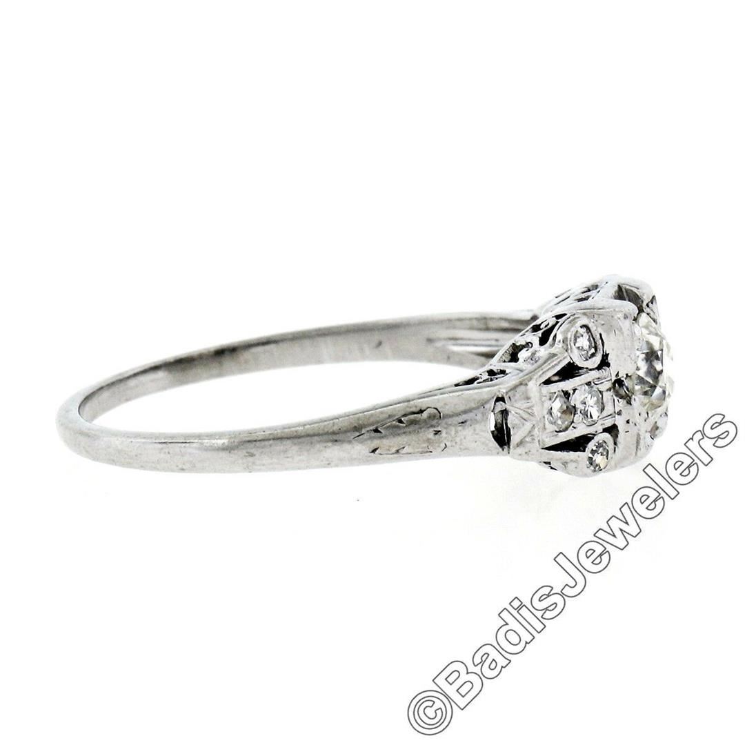 A platinum art deco period ring featuring a 0.30ct old European cut diamond (J - VS2) prong set atits center among 0.20ctw of bezel and pave set round single cut diamonds (G - VS1/VS2). The ring is size 7.0, weighs a total of 3.83 grams, and measures 6.35mm wide.