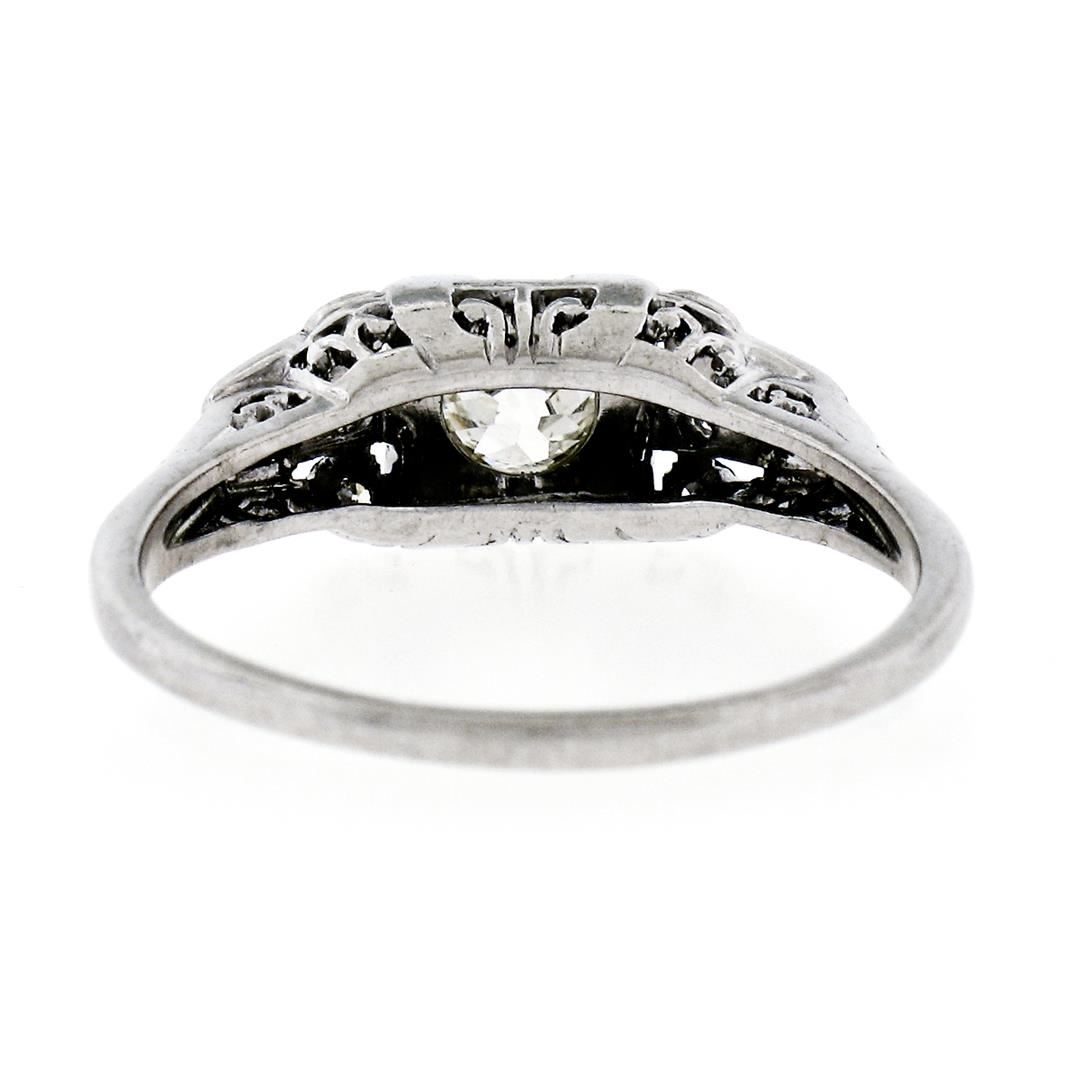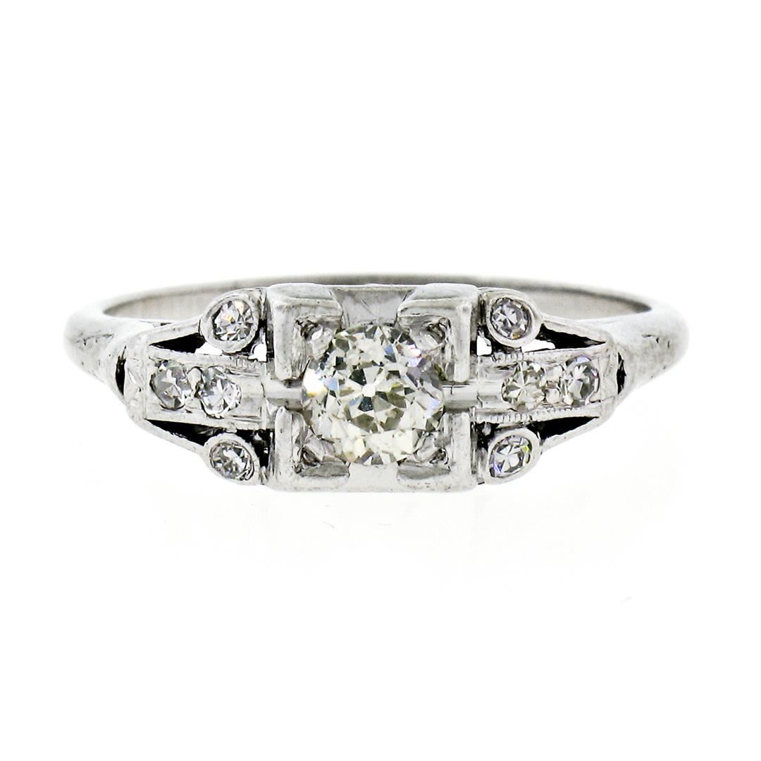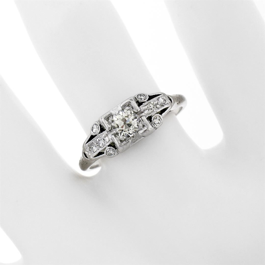A platinum art deco period ring featuring a 0.30ct old European cut diamond (J - VS2) prong set at its center among 0.20ctw of bezel and pave set round single cut diamonds (G - VS1/VS2). The ring is size 7.0, weighs a total of 3.83 grams, and measures 6.35mm wide.