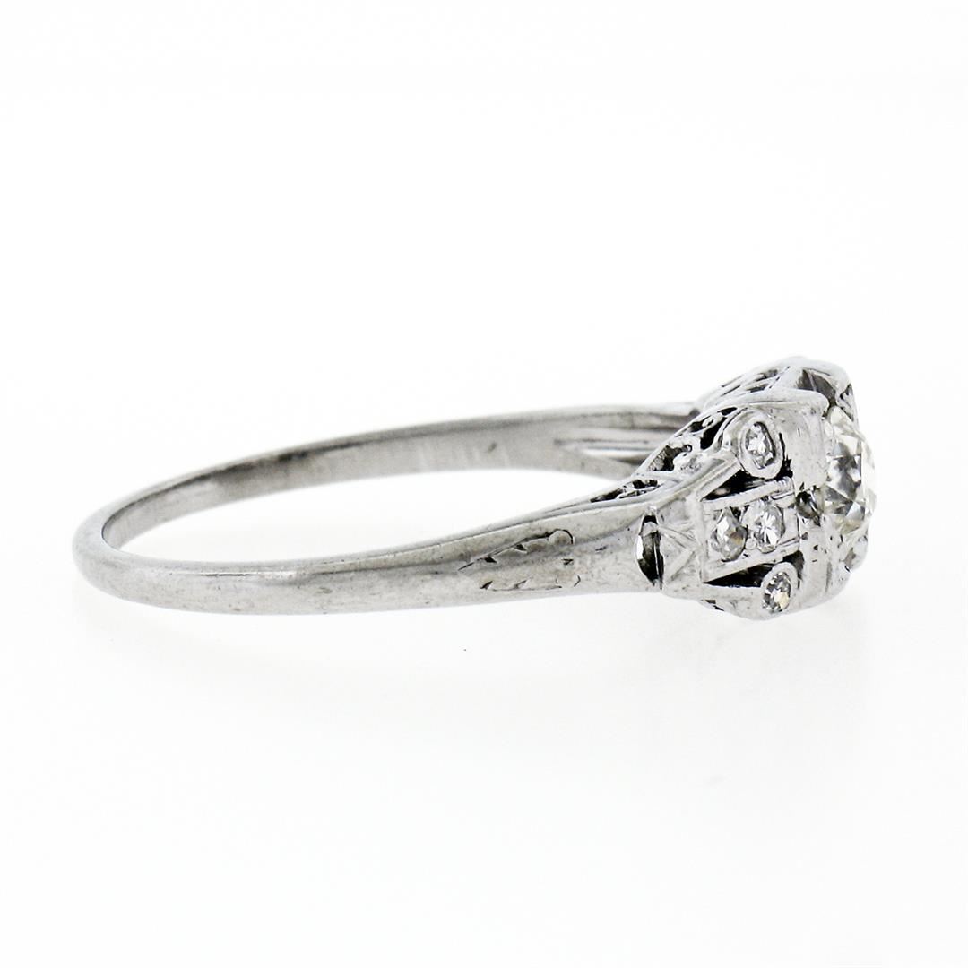 A platinum art deco period ring featuring a 0.30ct old European cut diamond (J - VS2) prong set at its center among 0.20ctw of bezel and pave set round single cut diamonds (G - VS1/VS2). The ring is size 7.0, weighs a total of 3.83 grams, and measures 6.35mm wide.