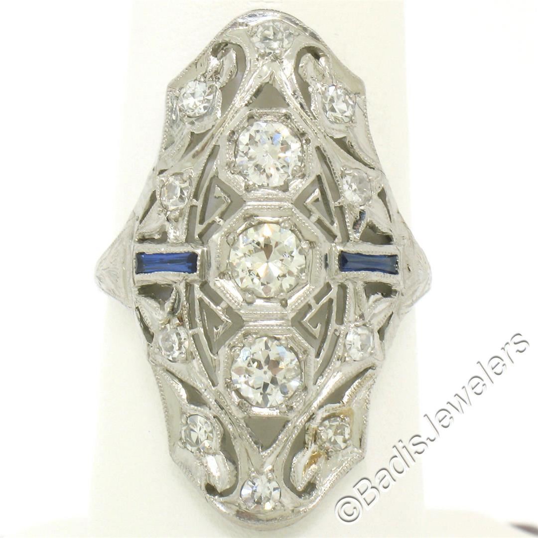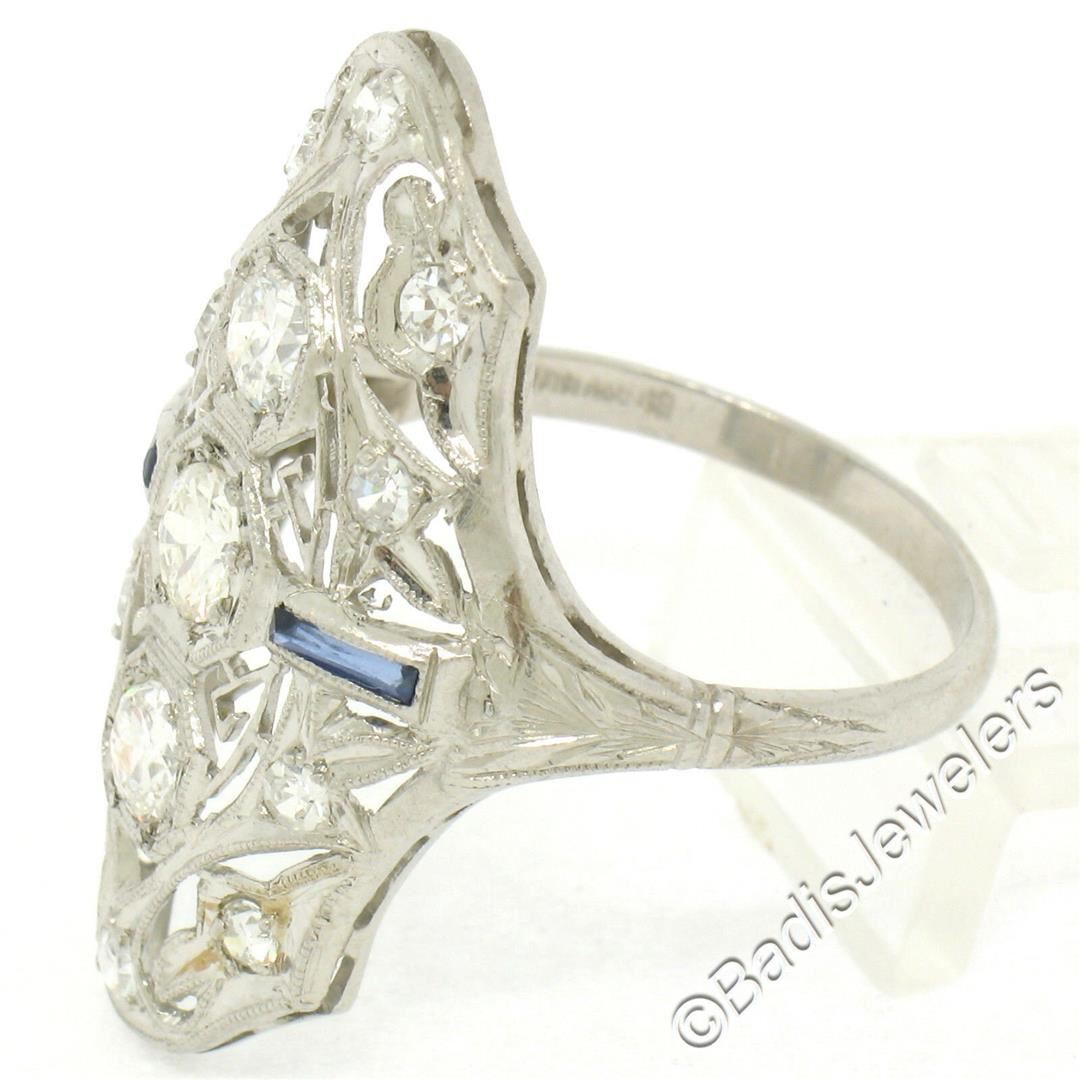 An art deco period platinum dinner ring with 1.20ctw of round diamonds (F/G - VS1 to SI1) and synthetic sapphire accents. The ring is size 7.5, weighs a total of 5.0 grams, and measures 29.1mm wide.