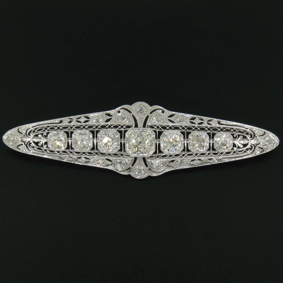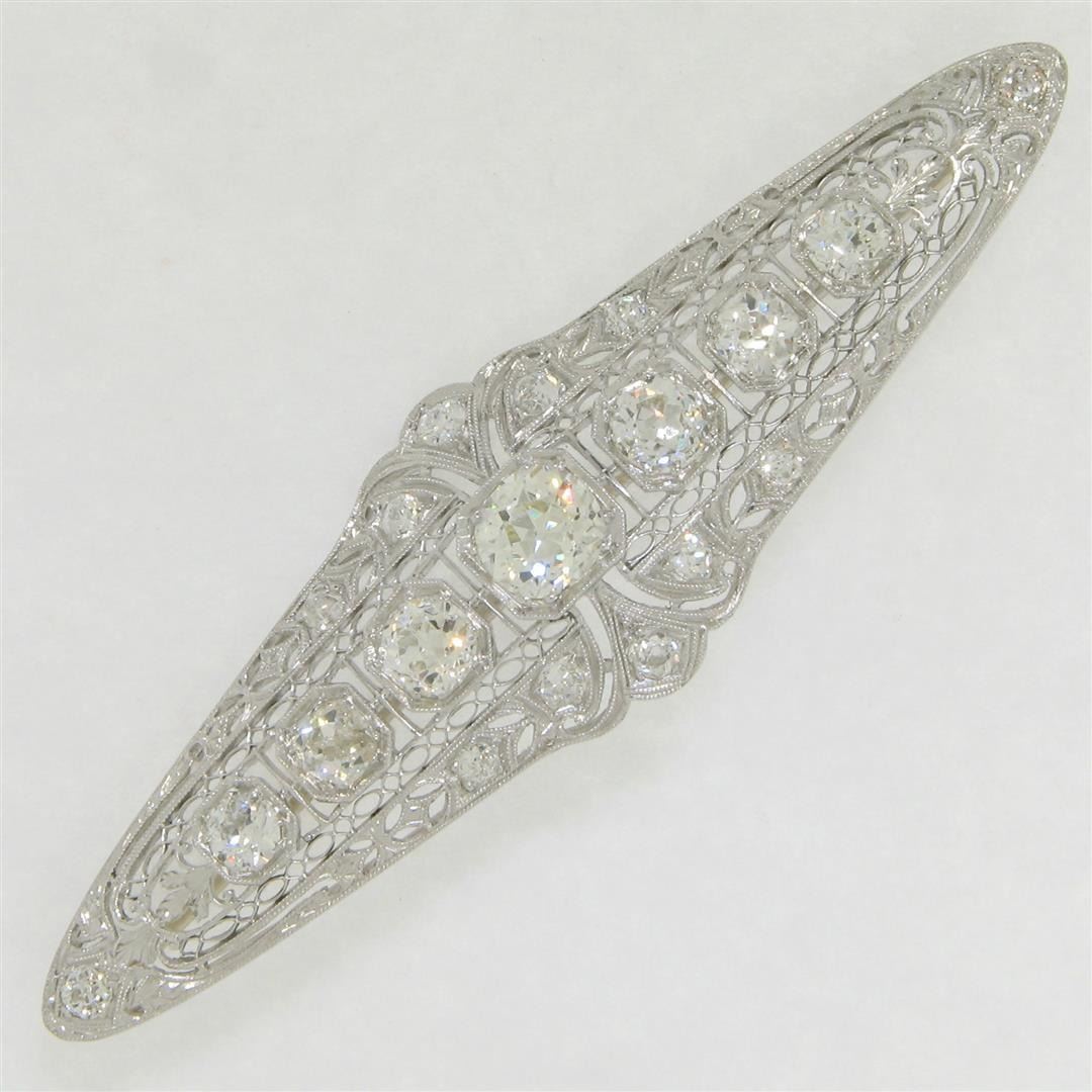 An art deco period platinum filigree brooch with a central 1.58ct old European cut diamond (K - SI1) surrounded by 4.42ctw of European and mine cut diamonds (G to I - VS2 to SI2). Measures 21.10x75.05mm and weighs a total of 12.84 grams.