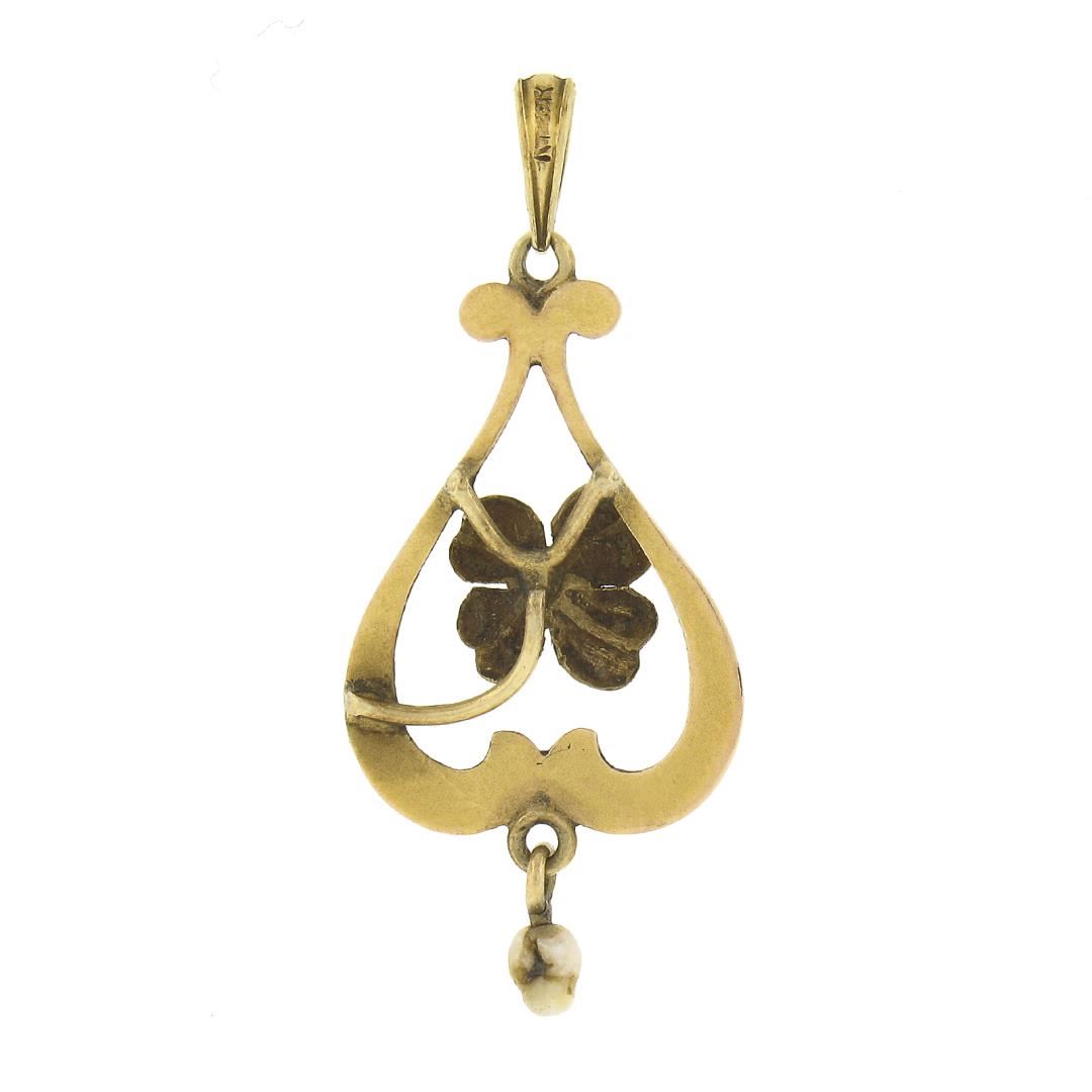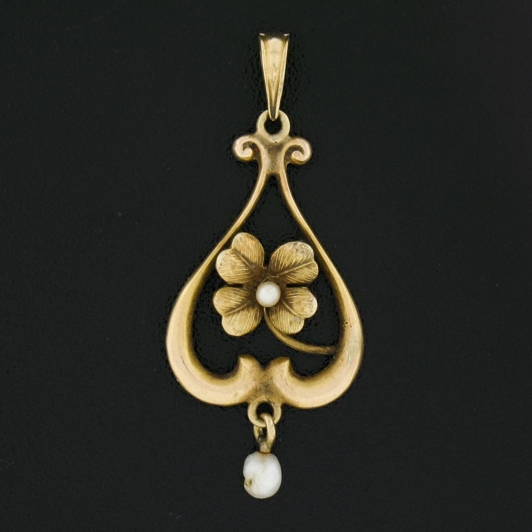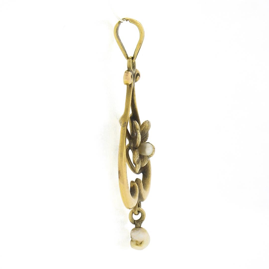 An antique solid 14k yellow gold lavalier pendant, with 1 bead shape cultured seed pearl (1.7mm), and 1 baroque shape culrured pearl (3x2.4mm). The pendant weighs a total of 0.91 grams, measures 25.1x13.2mm including the bail, and the inside of the bail measures 4.6x2.4mm.