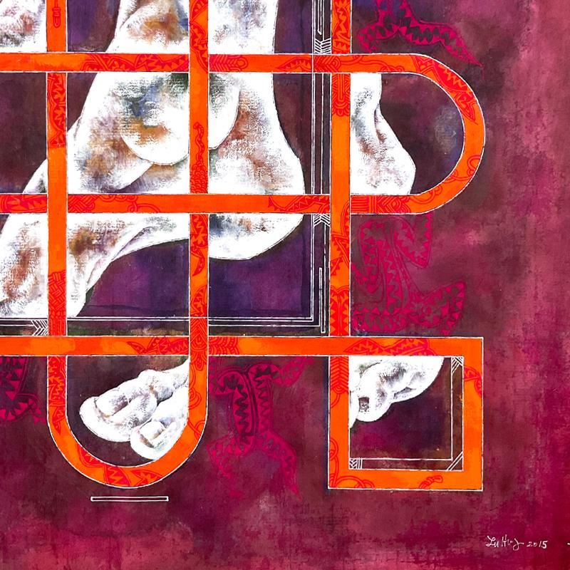 "Ashtamangala Dravya - Knot" is an original mixed media painting on paper by Lu Hong, hand signed by the artist. This piece comes custom framed. Includes Letter of Authenticity. Measures approx. 31" x 31.5" (frame), 20" x 20" (image).