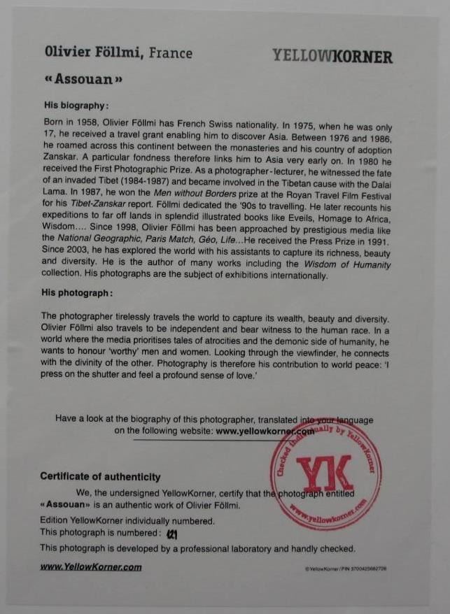 Assouan Certified Photograph, Olivier Follmi YellowKorner Certified Photograph. Certificate of Authenticity from YellowKorner affixed to the back. Matted Dimensions 16"x20". Protected with Clear Mylar Sleeve.
