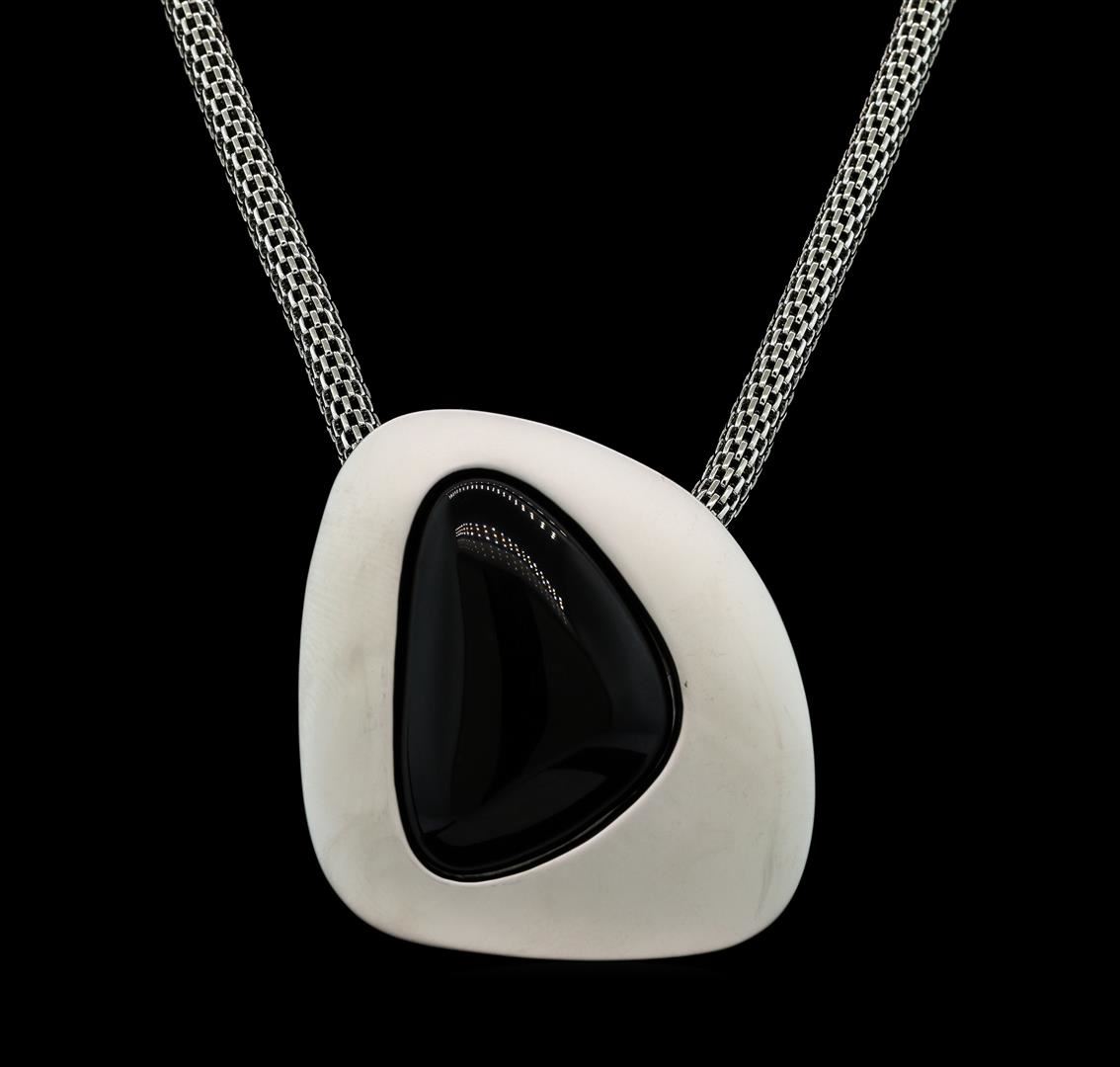 High end designer jewelry. Asymmetry Stone Pendant Short Necklace - Rhodium. Rhodium/ Black2 Inches Ext.. Silver/ Black. 16inches.