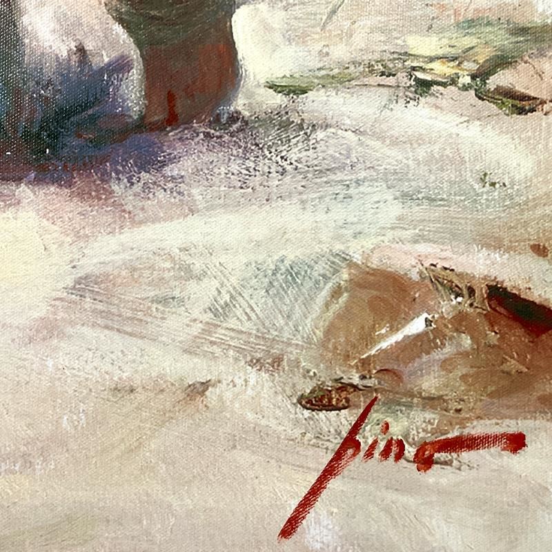 "At the Beach" is an hand embellished limited edition giclee on canvas by Pino (1939-2010), numbered and hand signed by the artist. Includes Certificate of Authenticity. Measures approx. 40" x 30" (image).