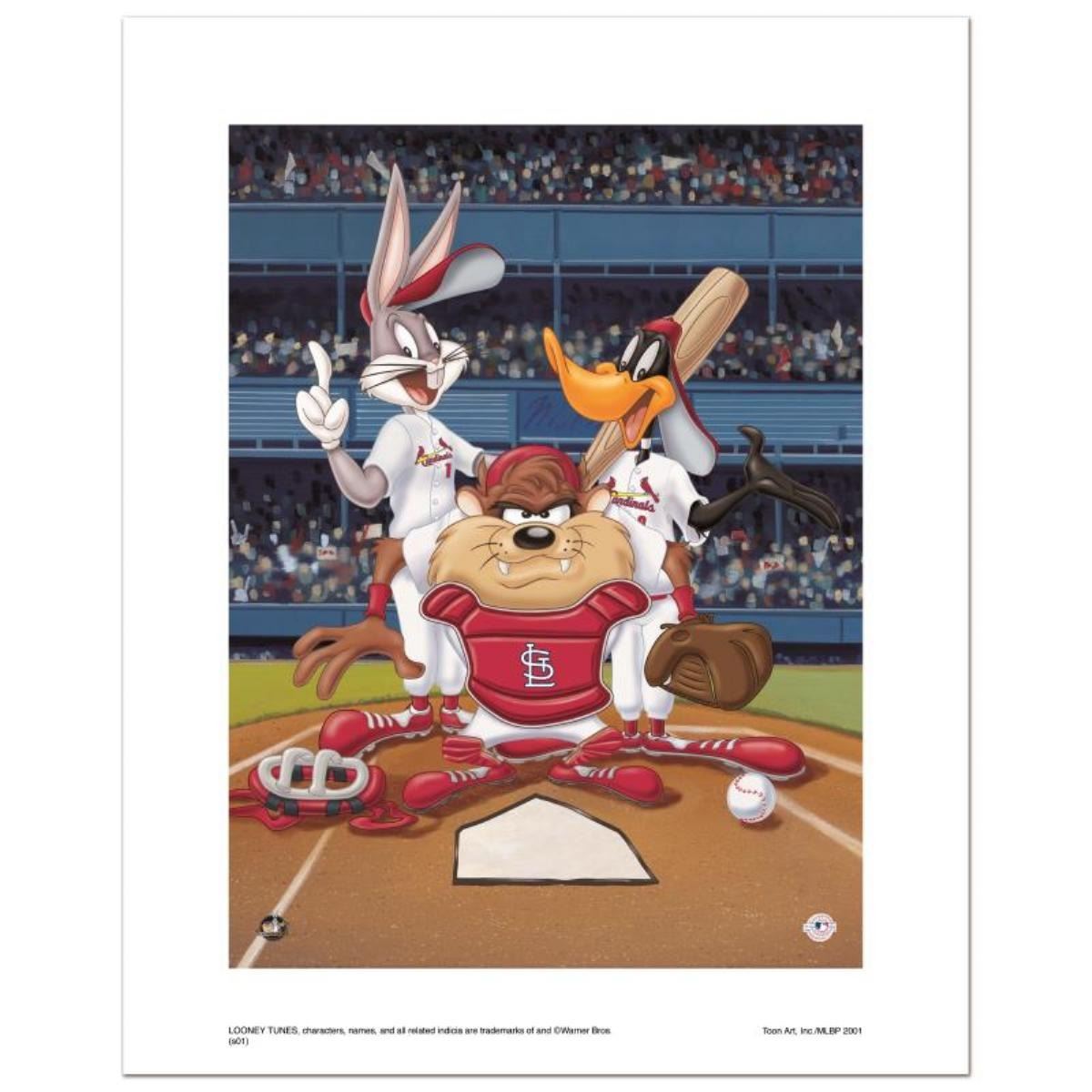 "At the Plate (Cardinals)" is a limited edition giclee on paper from Warner Bros. featuring iconic Looney Tunes characters in St. Louis Cardinals MLB uniforms. It comes numbered, with hologram seal, and a Certificate of Authenticity! Measures approx. 16 x 20" (with border), 12" x 16" (image).