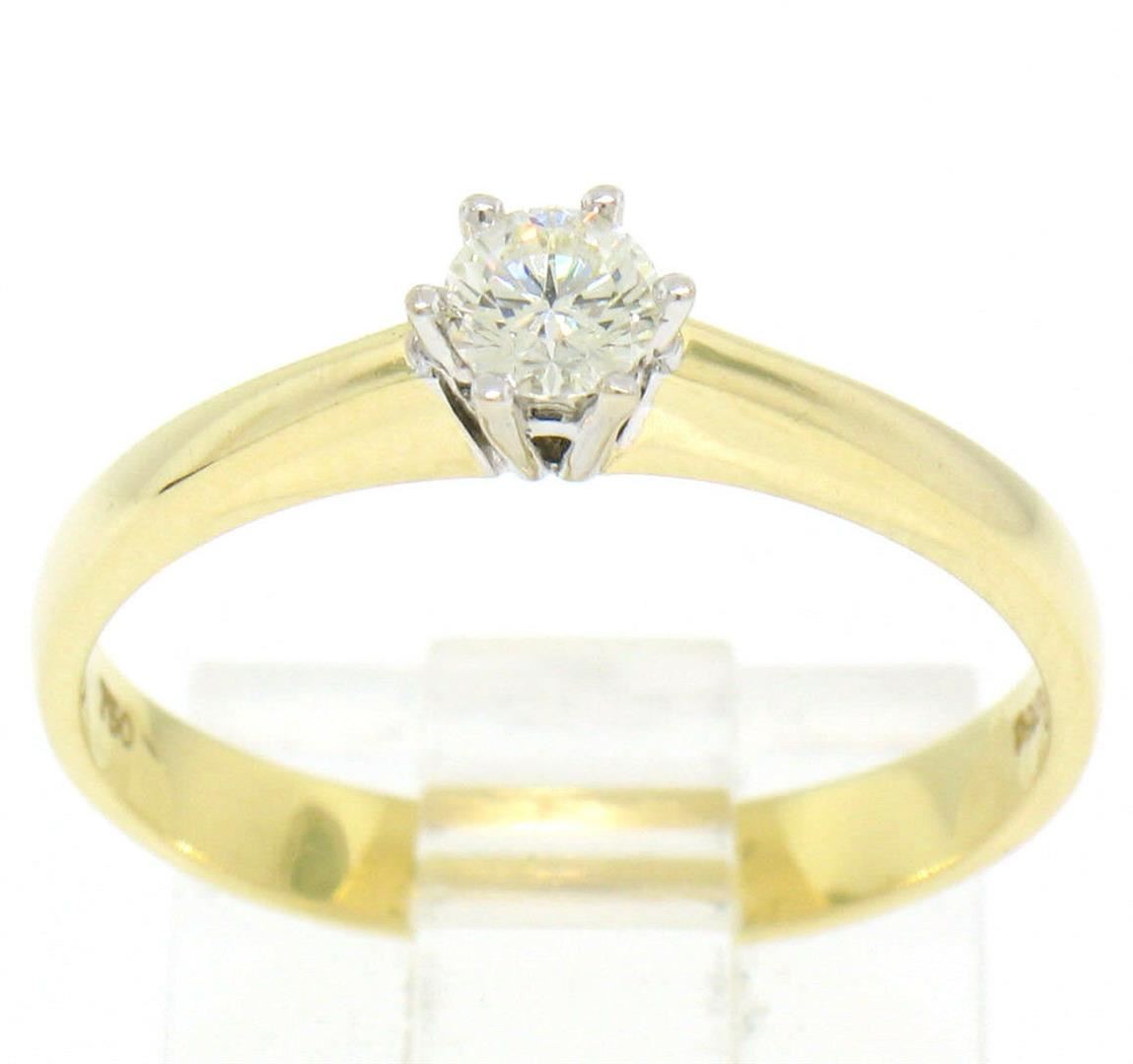 A like new 18kt yellow gold engagement ring by Atasay featuring a 0.23ct round diamond (G - VS1) prong set in 18kt white gold. The ring is size 8, weighs a total of 3.3 grams, and measures 4.64mm wide.