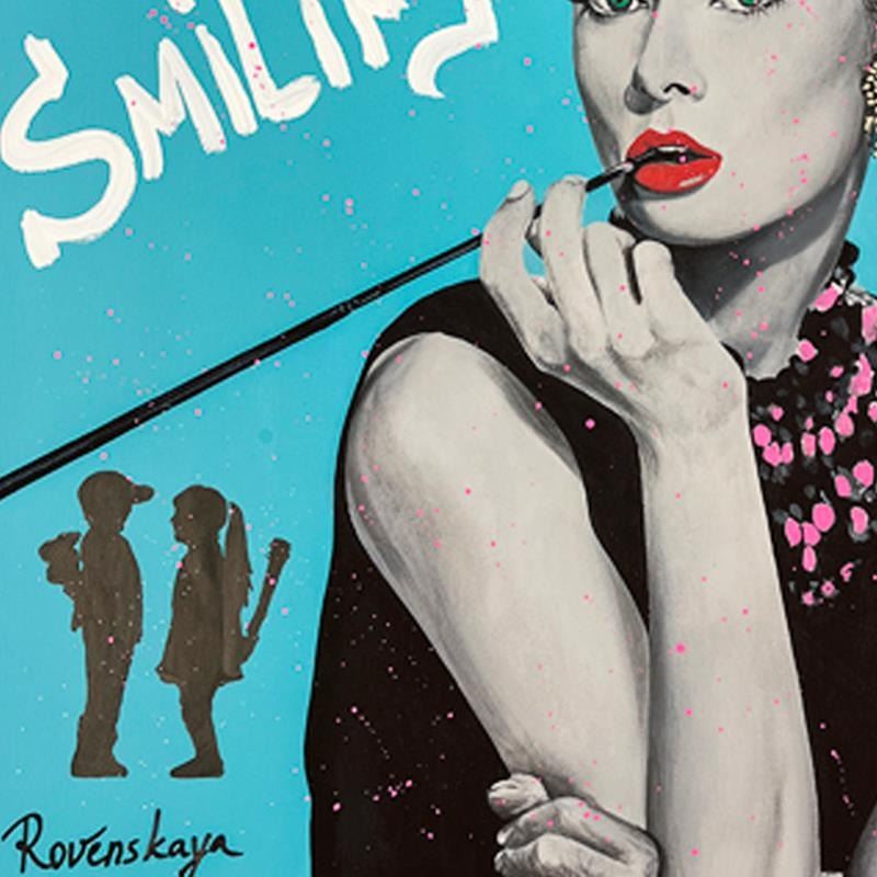 "Audrey " is a one-of-a-kind mixed media on deckle edge paper by Nastya Rovenskaya; hand signed by the artist. This piece comes custom framed and includes letter of authenticity. Measures approximately 36" x 30.5" (framed), 30" x 24.5" (image).