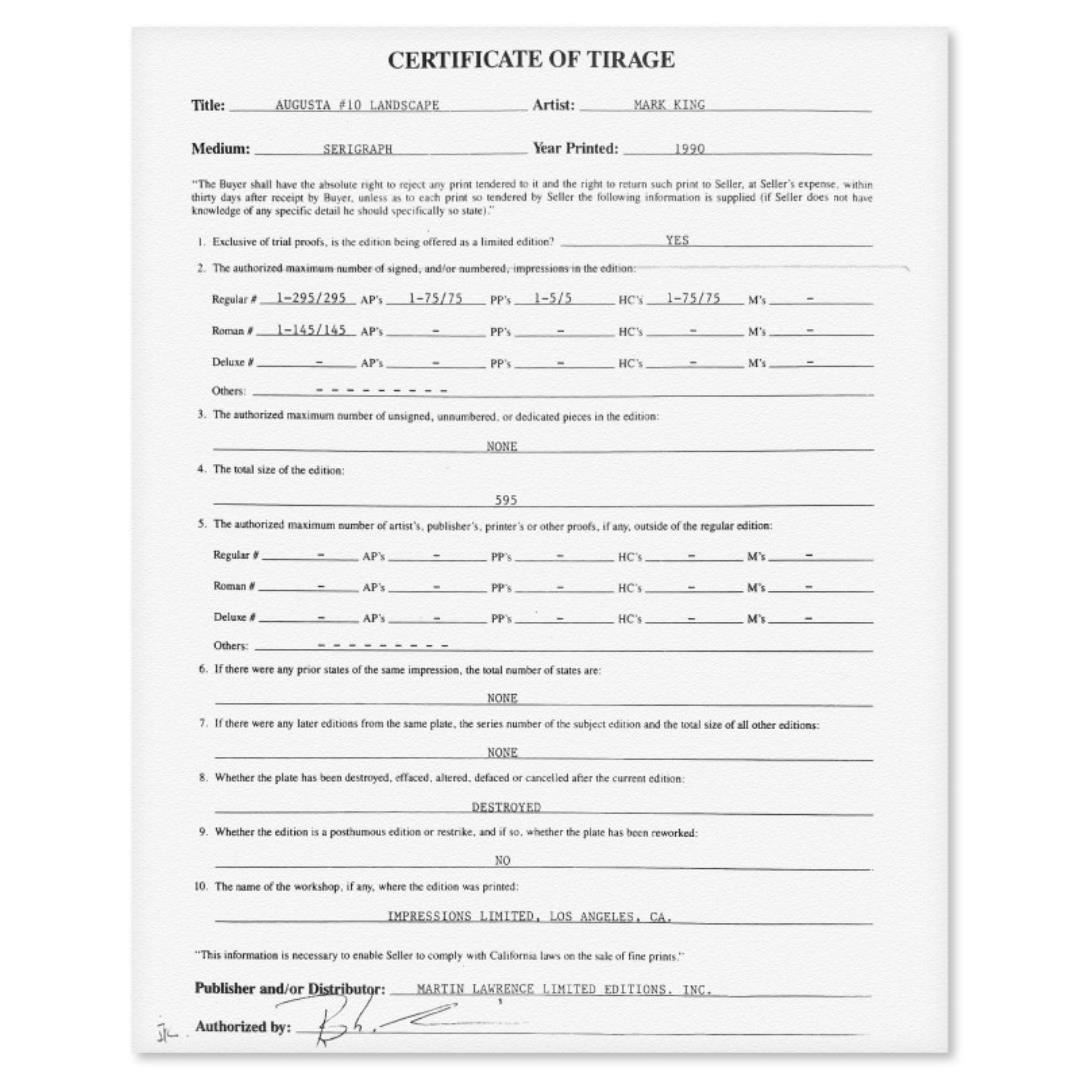 "Augusta #10 Landscape" is a limited edition serigraph on paper by Mark King (1931-2014). Hand signed and numbered, this piece comes with a letter of authenticity and measures approximately 27" x 36" (image).