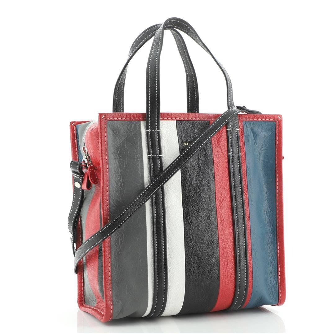 One Balenciaga Bazar Convertible Tote Striped Leather Small Blue, Multicolor, Red, White. Item is sold AS-IS. All available information is listed in the description and shown in the photo. Balenciaga Bazar Convertible Tote Striped Leather Small White, Yellow Condition Details: Minor wear in interior, scratches on hardware. Height 11", Width 11.5", Depth 6", Strap Drop 18