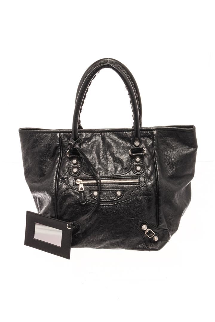 Balenciaga Black Lambskin Leather Velo Tote Bag. All available information is listed in the description and shown in the photos. balenciaga black lambskin leather velo tote bag with crafted from lambskin leather, it features dual top handles along with a zipper pocket on the front and a large studs detailing. the magnetic closure opens to a spacious canvas lined interior. Height: 14.96" Width: 6.69" Depth: 10.62", Handle Drop 12.59" / 38 x 17 x 27 Cm