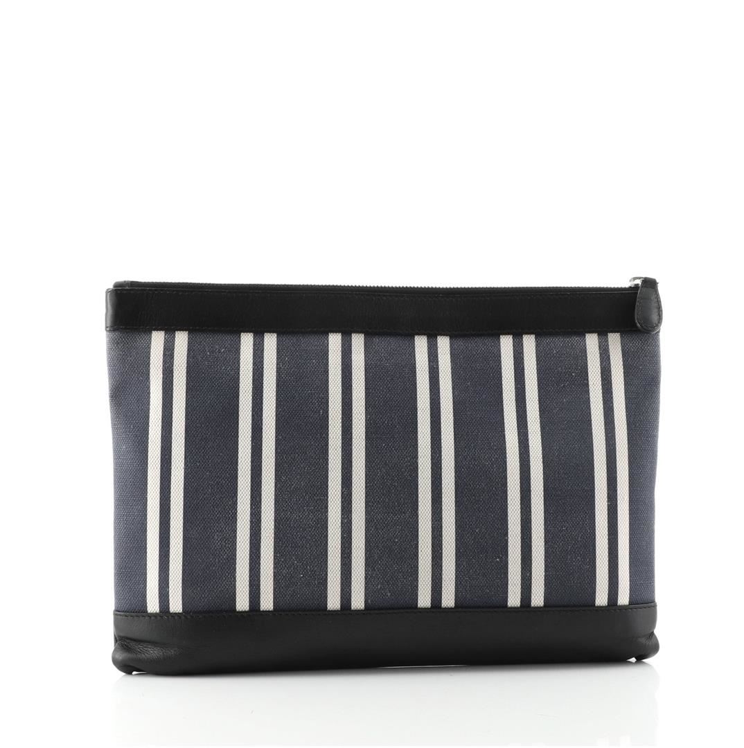 One Balenciaga Navy Zip Pouch Striped Canvas and Leather Large Black, Blue, Neutral. Item is sold AS-IS. All available information is listed in the description and shown in the photo. Balenciaga Navy Zip Pouch Striped Canvas and Leather Large Black Blue Beige Striped Leather Condition Details: Minor creasing on exterior, light scuffs and wear on leather trims, wear on base corners, scratches on hardware. Height 8.5", Width 12", Depth 1", Strap Drop None