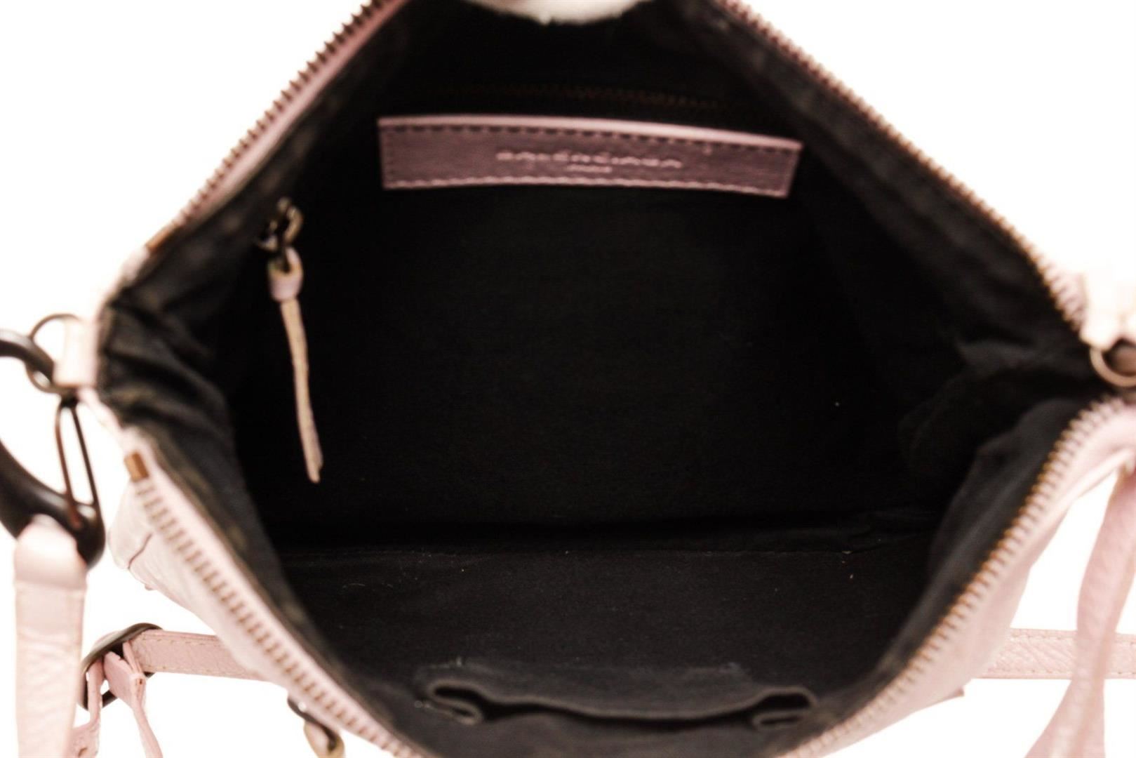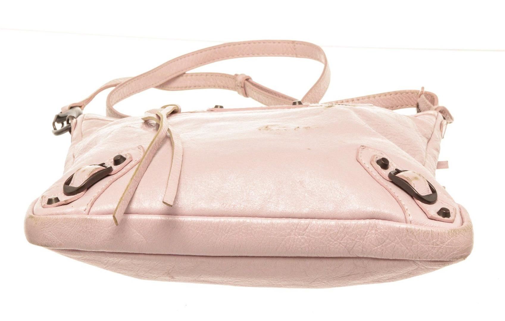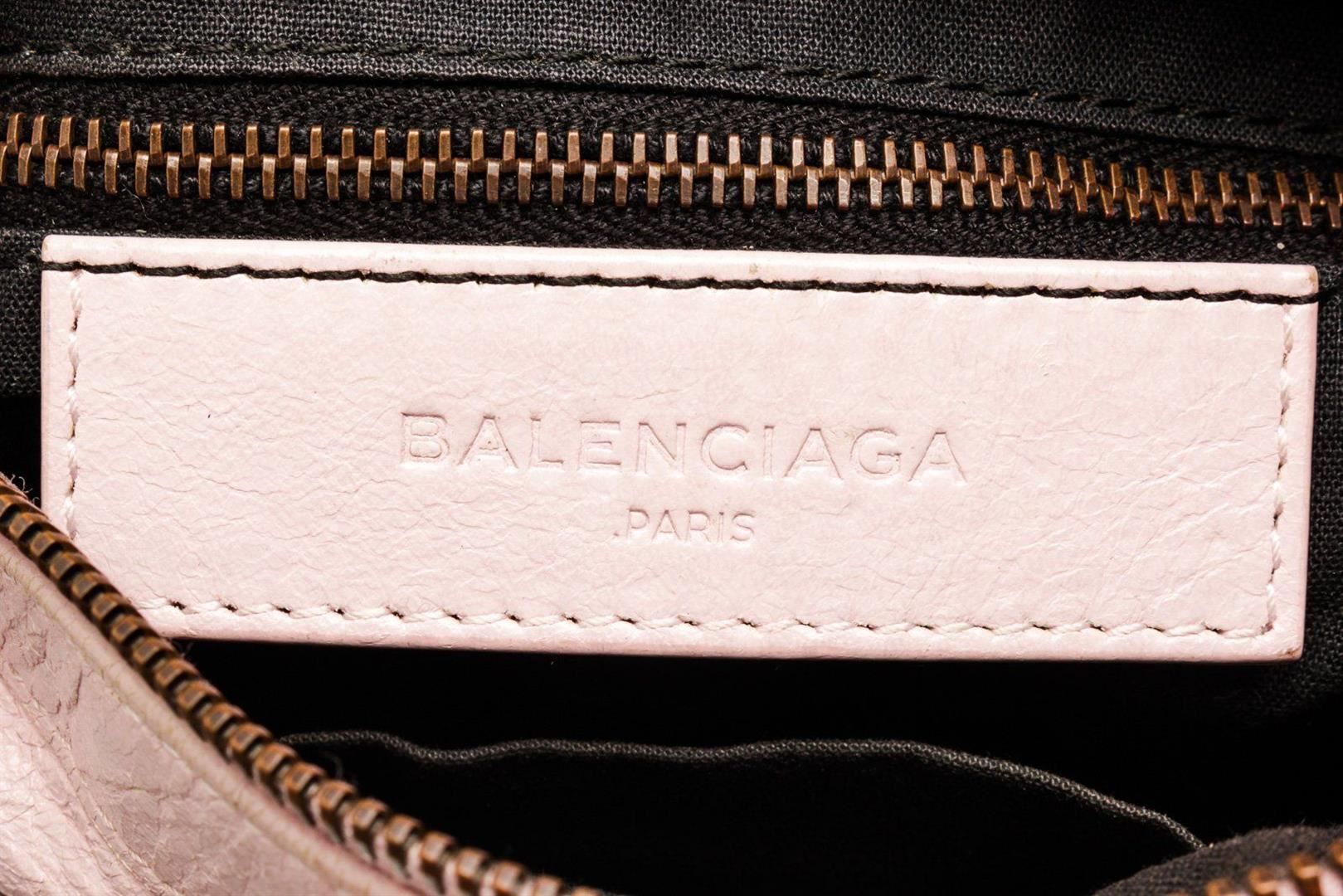 Balenciaga Pink Leather City Bag with silver-tone hardware, trim leather, exterior zip pocket, top handle, shoulder strap and zipper closure.
