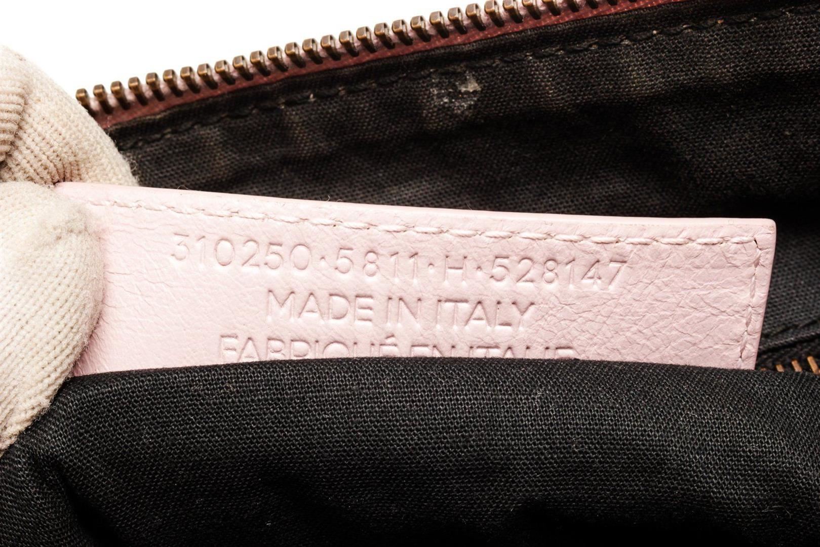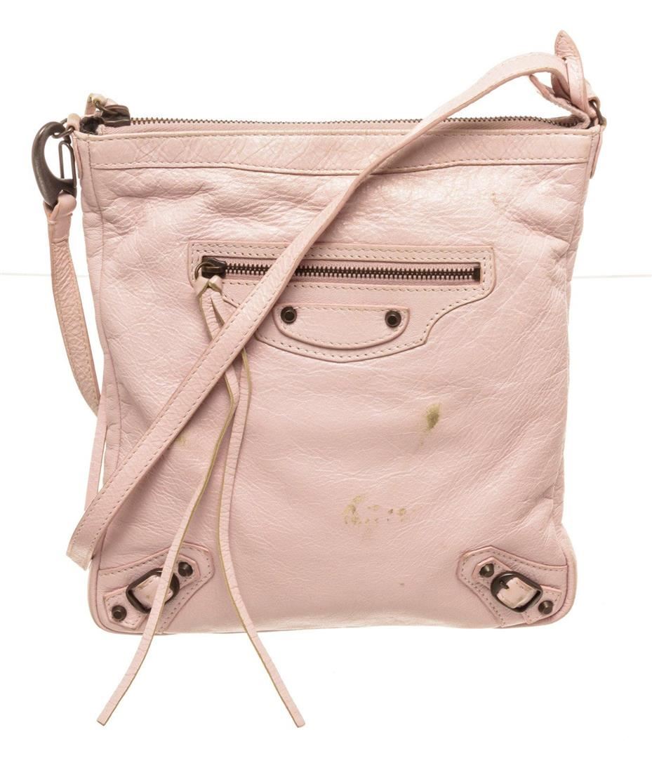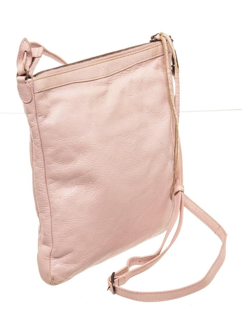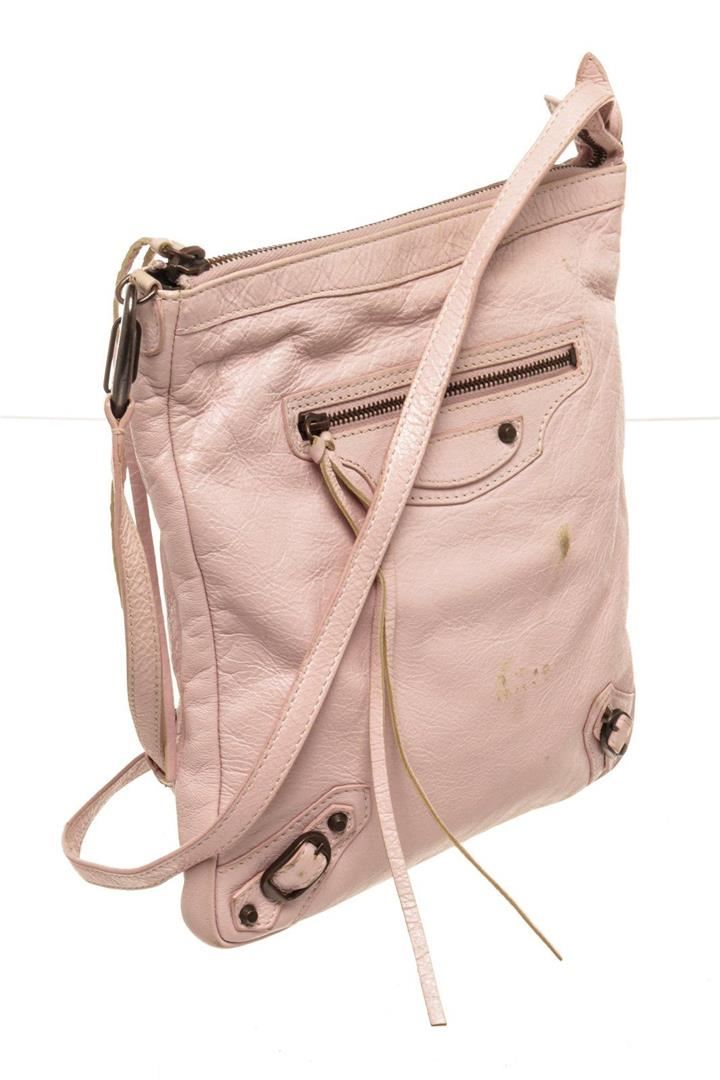 Balenciaga Pink Leather City Bag with silver-tone hardware, trim leather, exterior zip pocket, top handle, shoulder strap and zipper closure.