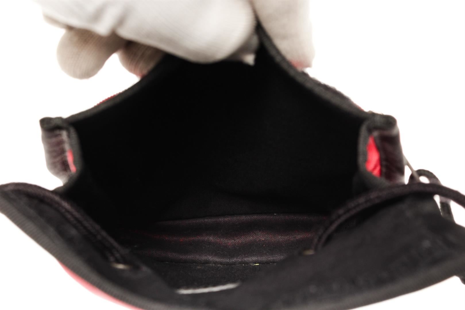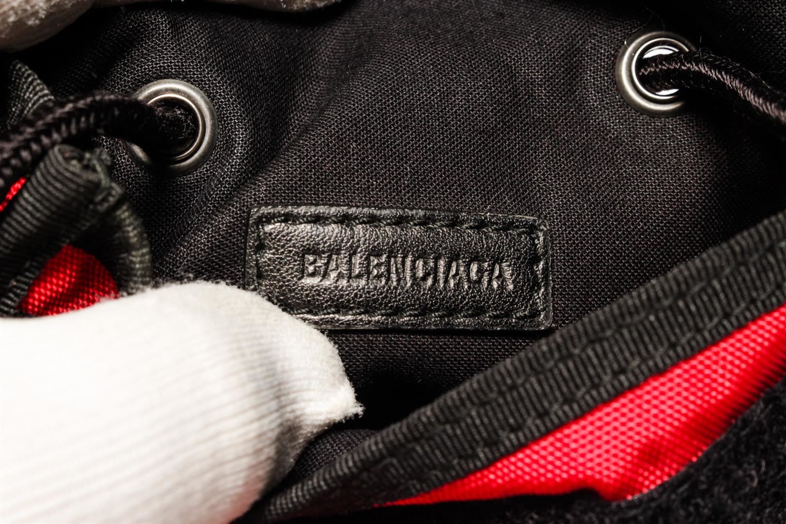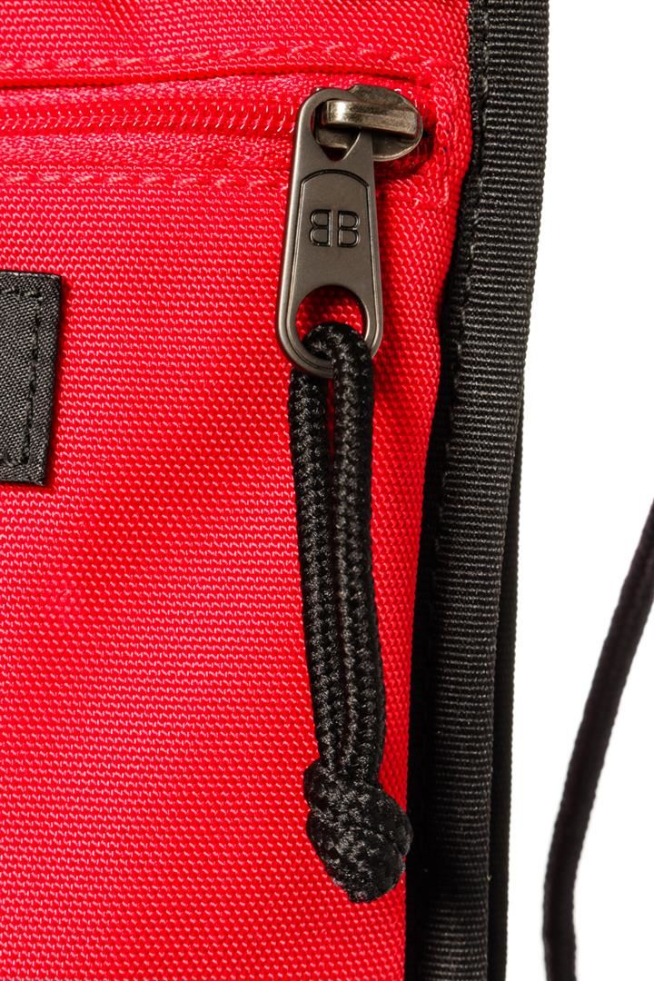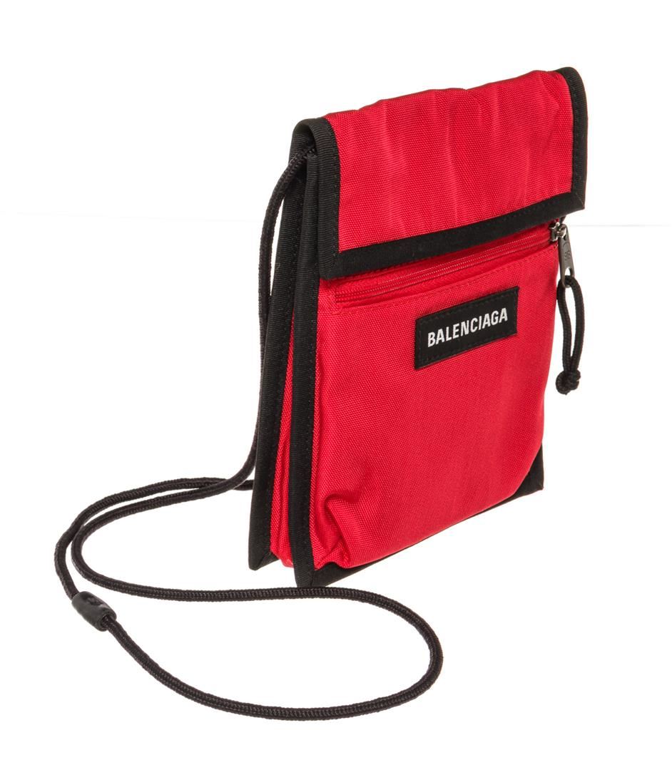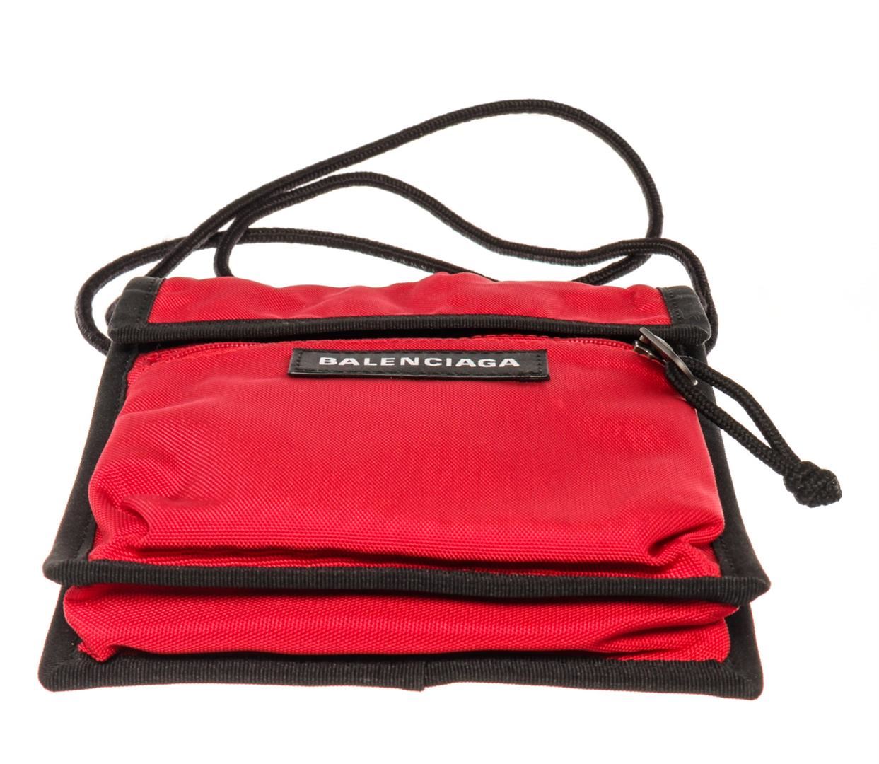One Balenciaga Red Black Canvas Explorer Small Pouch with Strap. Item is sold AS-IS. All available information is listed in the description and shown in the photo. Red canvas and black logo patch Balenciaga Explorer small pouch with silver-tone hardware, black canvas long strap, exterior pouch with zip closure and foldover top that will open to black canvas lining. L7.4 x H5.9 x W1.5 inch
