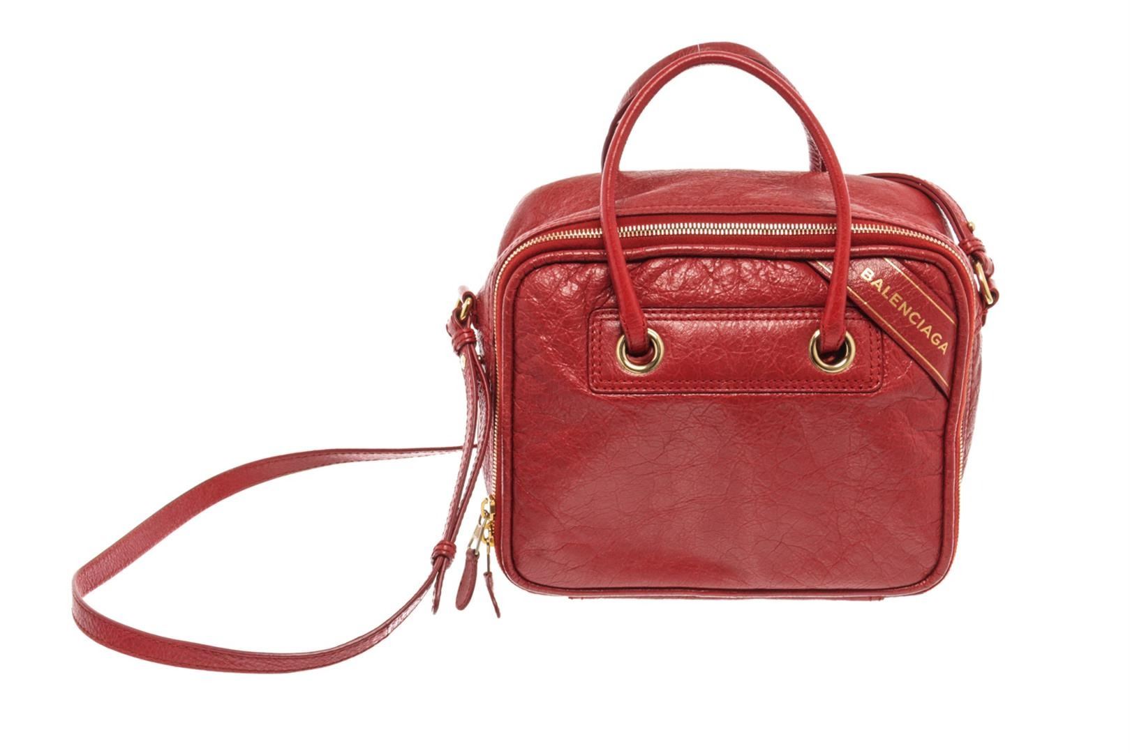 Balenciaga Red Leather Small Blanket Square Bag. All available information is listed in the description and shown in the photos. Balenciaga Red Leather Small Blanket Square Bag with rolled leather handles and an optional adjustable shoulder strap, This opens to a partitioned black fabric interior with patch pockets and a central zipper compartment. Height: 8 in (20.32 cm), Width: 9.5 in (24.13 cm), Depth: 4 in (10.16 cm)