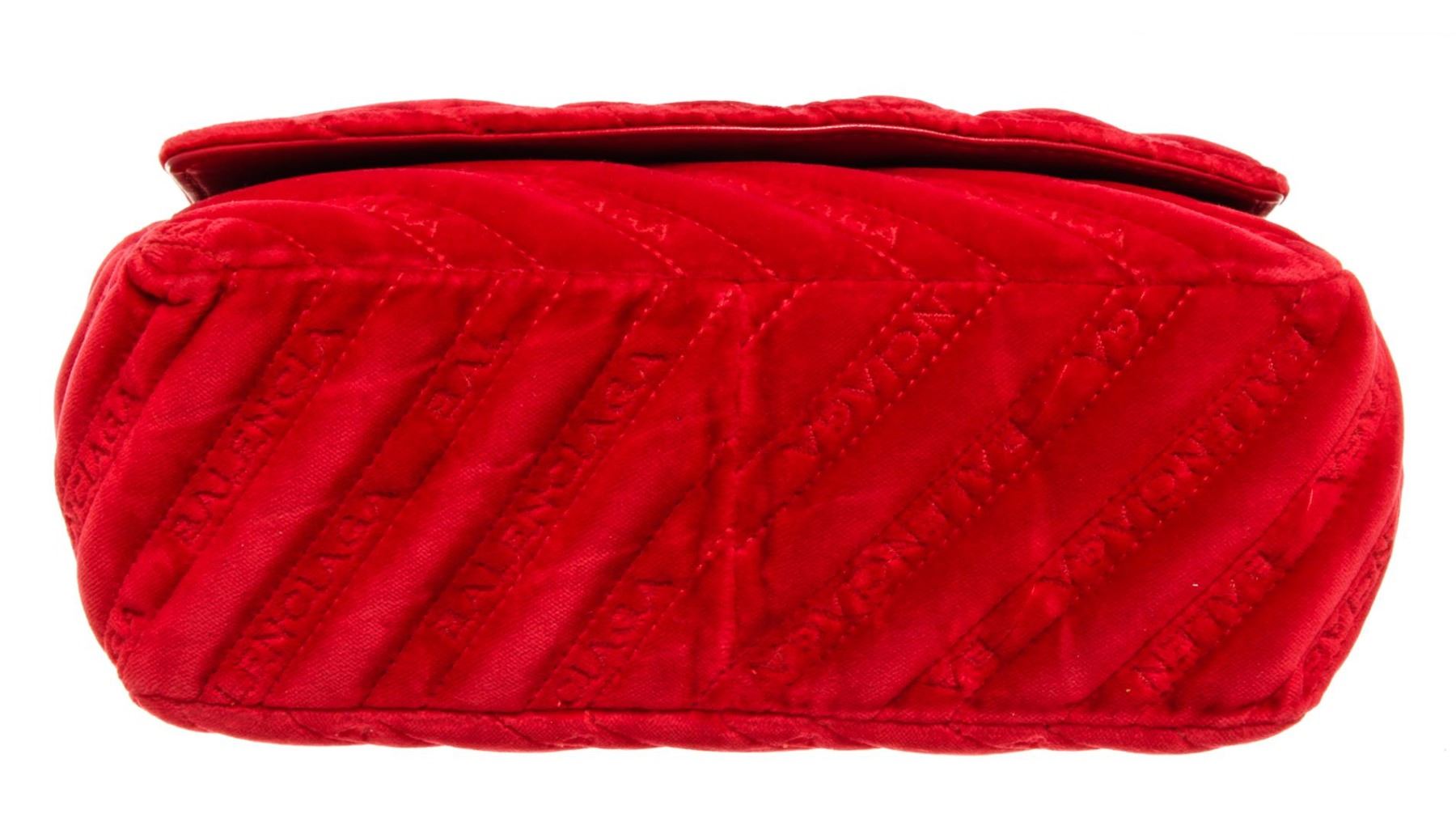 One Balenciaga Red Velvet BB Chain Shoulder Bag. Item is sold AS-IS. All available information is listed in the description and shown in the photo. Balenciaga Red Velvet BB Chain Shoulder Bag with a chain shoulder strap, gold hardware, leather lining, six card holders, one zipper pocket, snap closure.