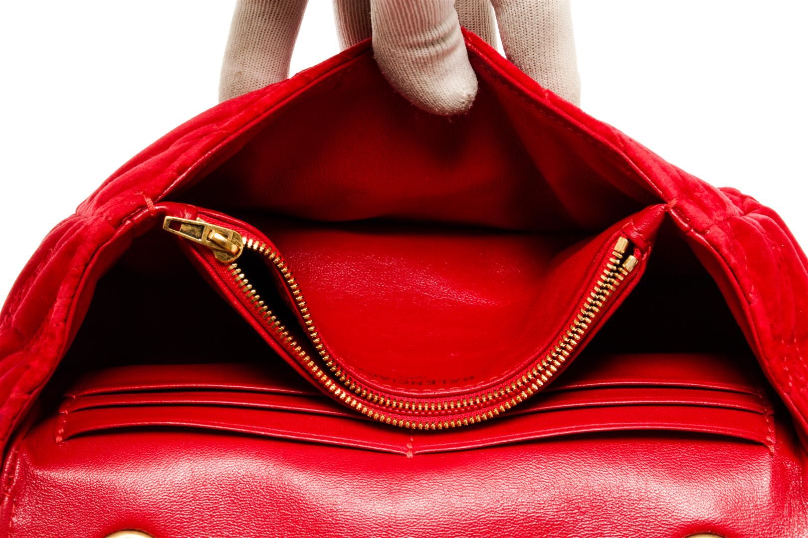 One Balenciaga Red Velvet BB Chain Shoulder Bag. Item is sold AS-IS. All available information is listed in the description and shown in the photo. Balenciaga Red Velvet BB Chain Shoulder Bag with a chain shoulder strap, gold hardware, leather lining, six card holders, one zipper pocket, snap closure.