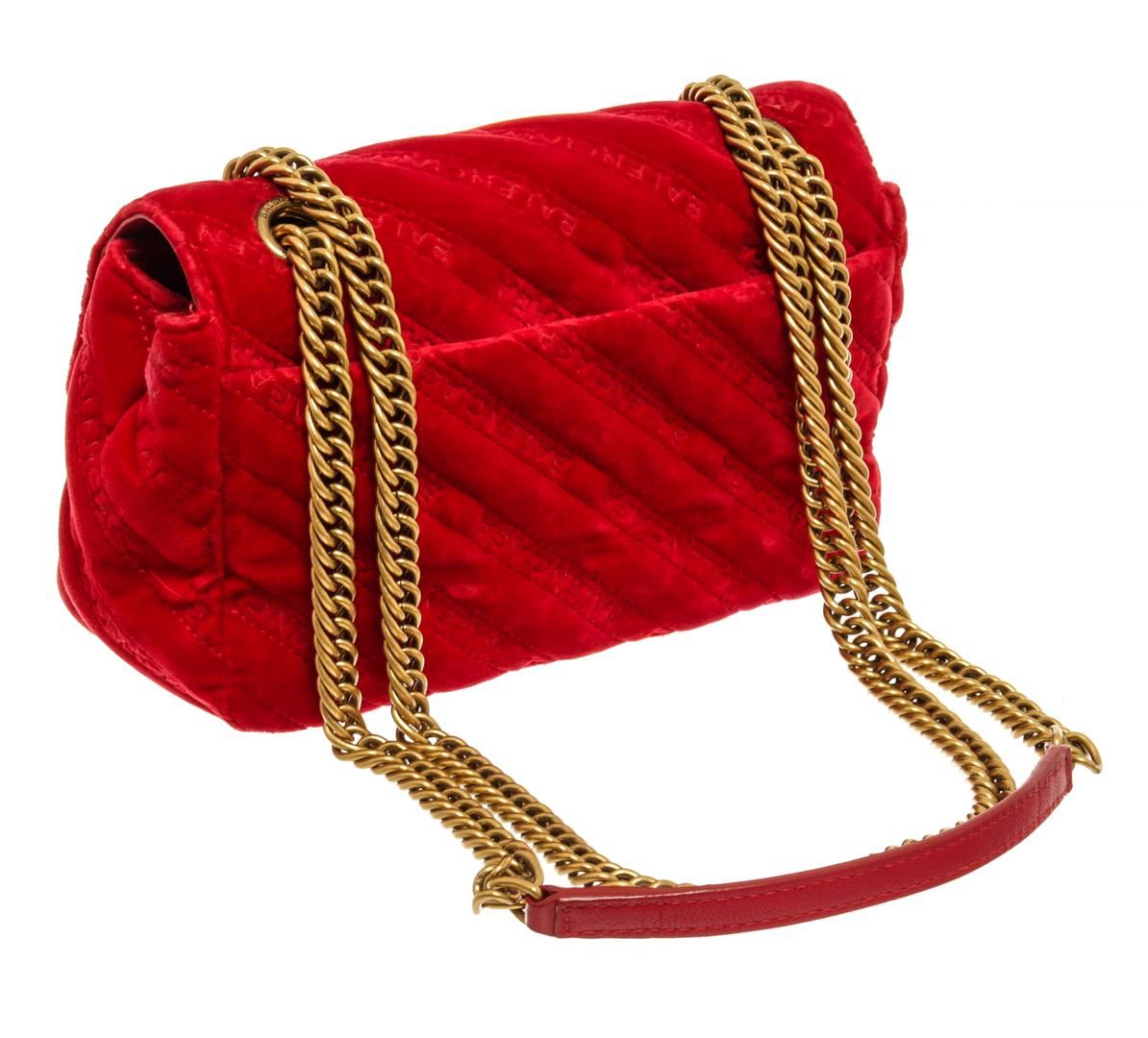 One Balenciaga Red Velvet BB Chain Shoulder Bag. Item is sold AS-IS. All available information is listed in the description and shown in the photo. Balenciaga Red Velvet BB Chain Shoulder Bag with a chain shoulder strap, gold hardware, leather lining, six card holders, one zipper pocket, snap closure.