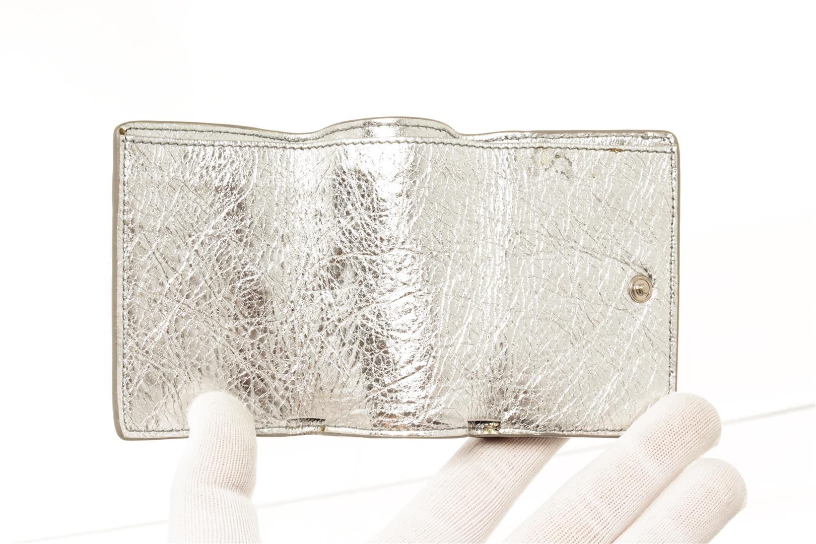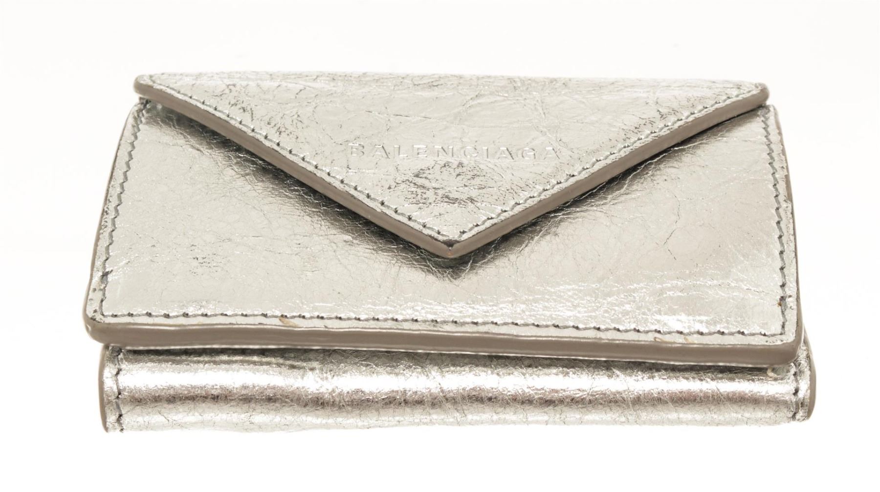 One Balenciaga Silver Papier Flap Mini Wallet. Item is sold AS-IS. All available information is listed in the description and shown in the photo. Balenciaga Silver-toned Papier flap mini wallet features an envelope style with a leather exterior with an embossed logo, a fold-over top with snap closure, and two compartments: one for coins or miscellaneous and one for cash.