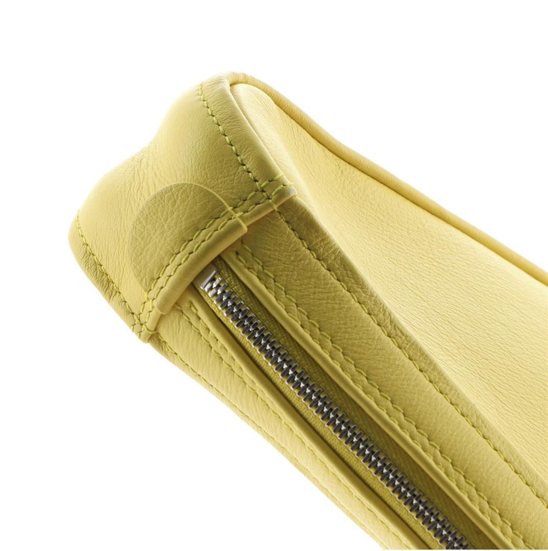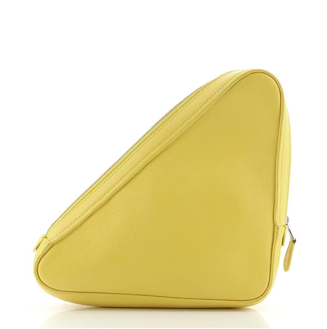 One Balenciaga Triangle Pouch Leather Medium Yellow. Item is sold AS-IS. All available information is listed in the description and shown in the photo. Balenciaga Triangle Pouch Leather Medium Black Condition Details: Minor creasing, scuffs and wear on exterior, scratches on hardware. Height 8", Width 8", Depth 2", Strap Drop None