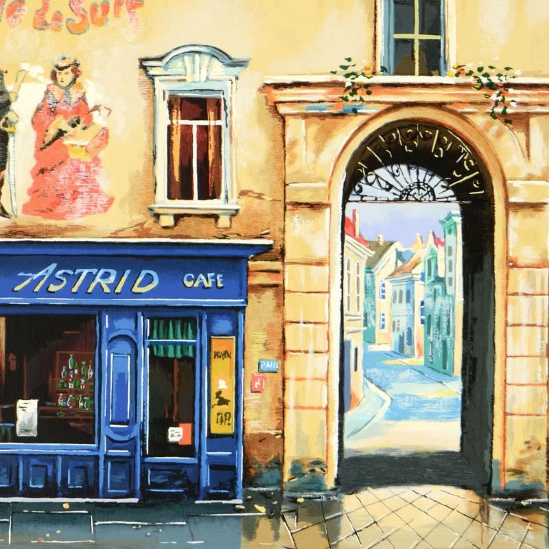 "Bar Astrid" is a limited edition serigraph on paper by Alexander Borewko, numbered and hand signed by the artist. Includes Letter of Authenticity. Measures approx. 35" x 15" (border), 31" x 15" (image). Please note: there is very minor wear on the frame.