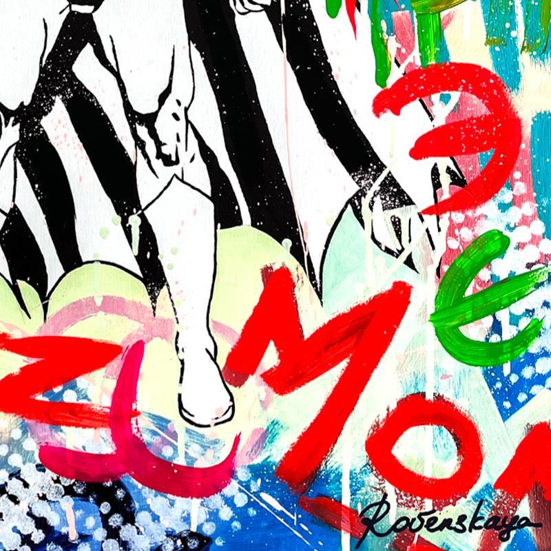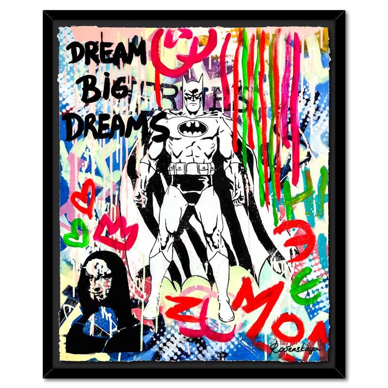 "Batman" is a one-of-a-kind mixed media on deckle edge paper by Nastya Rovenskaya; hand signed by the artist. This piece comes custom framed and includes letter of authenticity. Measures approximately 36" x 30" (framed), 30" x 24" (image).