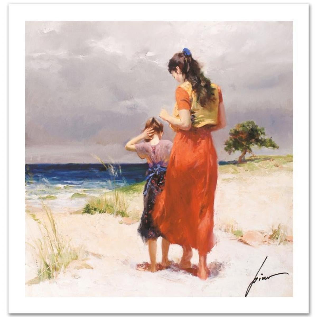 "Beach Walk" is a limited edition giclee on paper by Pino (1939-2010). The piece comes numbered and is hand signed by the artist. Includes Certificate of Authenticity. Measures approxiamtely 16 x 16" (image).