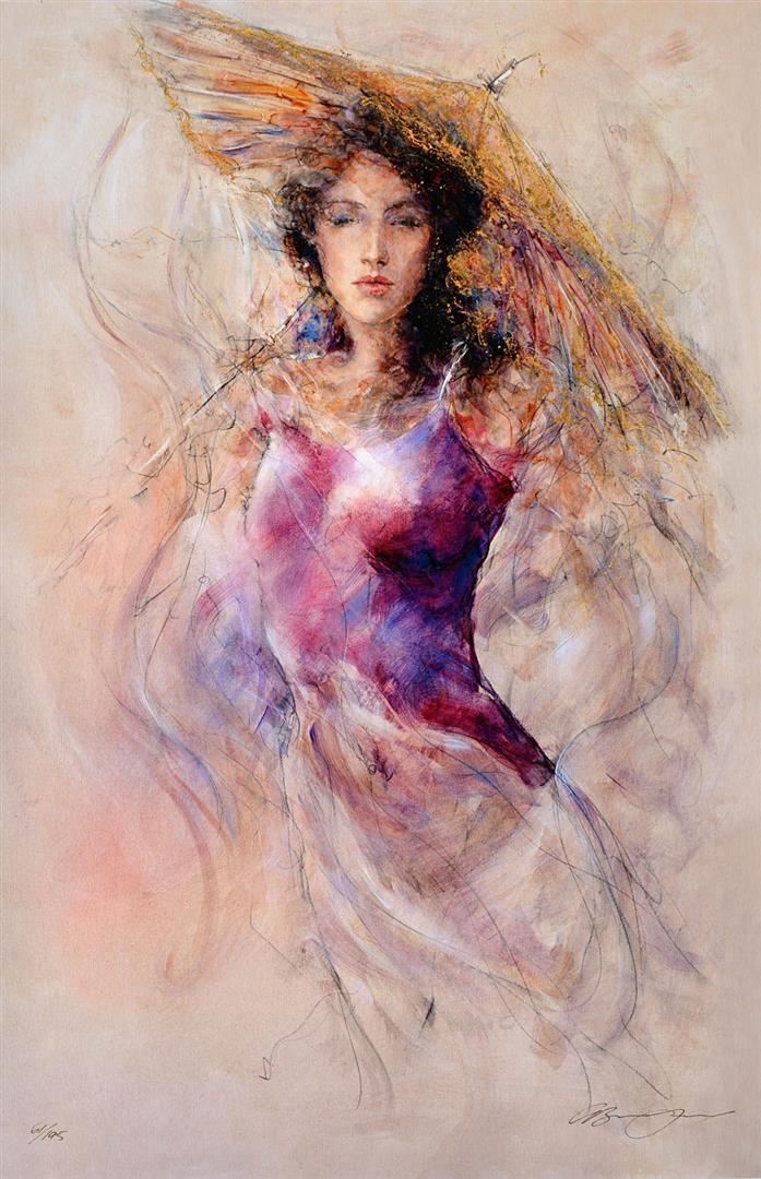 Artist: Gary Benfield - Title: Aine - Medium: Fine Art Giclee on Canvas - Signature: Hand-signed by the Artist - Limited Edition: 195 - Image Size: Approximately 32.5 inches x 21 inches - Framed: Unframed on UnStretched Canvas - Details: This work comes with a Certificate of Authenticity - Biography: Benfield's paintings are drawn rapidly with an almost passionate urgency. Many sketches are immediately discarded, only those that feel right, that have integrity are presented to the public. This ensures that his work is dynamic yet maintains a strong organic unity. Few artists can, as well as Benfield, capture the sense of movement, both physical and emotional. After leaving the academic world he set up his own studio near London and concentrated on drawing and painting figures. Within a few years his work was collected throughout Europe and his reputation firmly established.
