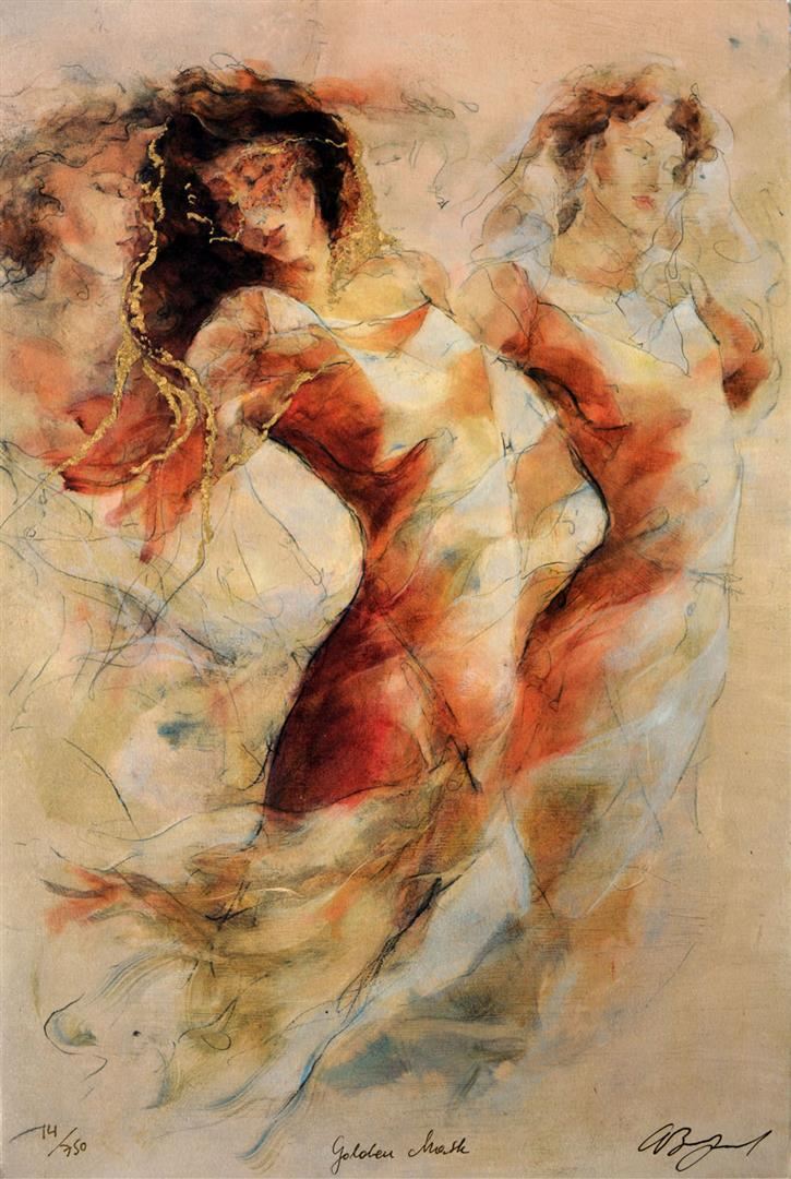 Artist: Gary Benfield - Title: Golden Mask - Medium: Serigraph on Fine Art Paper - Signature: Hand-signed by the Artist - Limited Edition: 750 - Image Size: Approximately 17.5 inches x 11.75 inches - Unframed - Details: This work comes with a Certificate of Authenticity - Biography: Benfield's paintings are drawn rapidly with an almost passionate urgency. Many sketches are immediately discarded, only those that feel right, that have integrity are presented to the public. This ensures that his work is dynamic yet maintains a strong organic unity. Few artists can, as well as Benfield, capture the sense of movement, both physical and emotional. After leaving the academic world he set up his own studio near London and concentrated on drawing and painting figures. Within a few years his work was collected throughout Europe and his reputation firmly established.