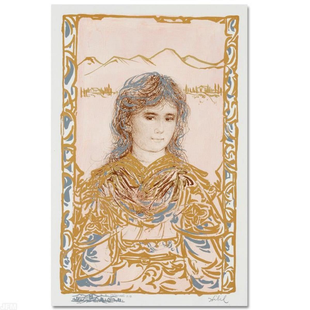 Wild lines and muted colors make Edna Hibel's art stand out in any room. "Becky" is a limited edition lithograph on paper, numbered and hand signed by Hibel (1917-2014). Includes Certificate of Authenticity! Measures approx. 12.5" x 20" (border) 9" x 16.5" (image).