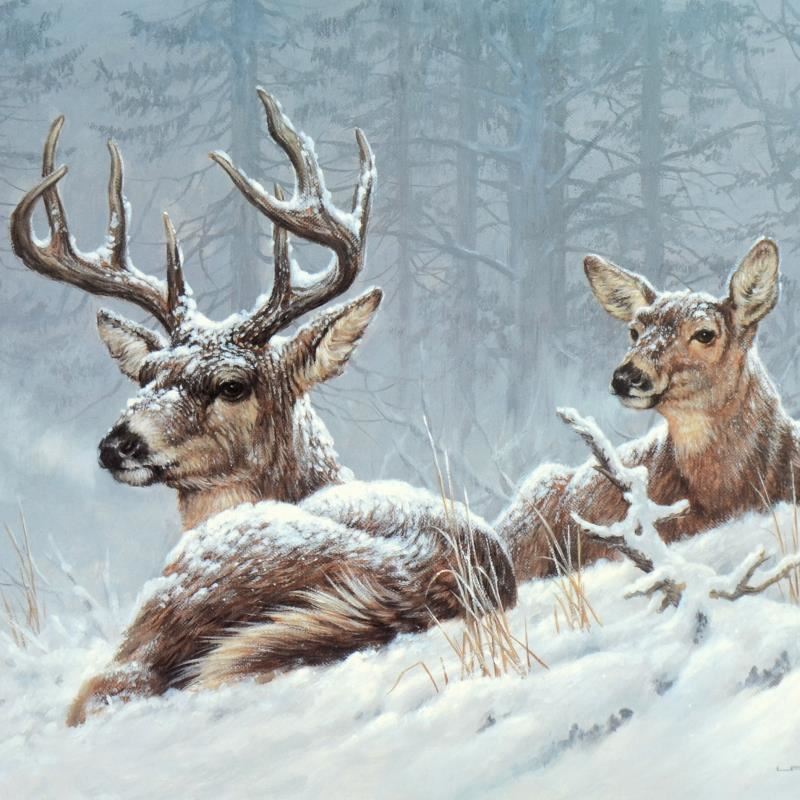 "Bedded Down - Whitetail Deer" is a limited edition lithograph on paper by Larry Fanning (1938-2014), numbered and hand signed with a Letter of Authenticity. Measures approximately 16" x 10.5" (image).