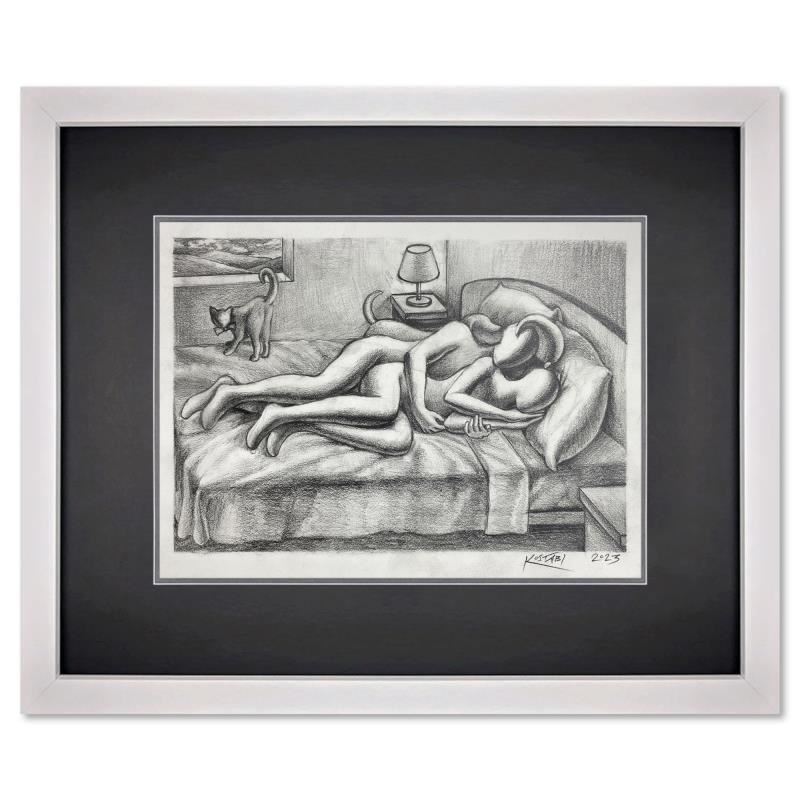 "Bedtime Stories" is an original drawing on paper by Mark Kostabi, hand signed by the artist. This piece comes custom framed. Includes Certificate of Authenticity. Measures approx. 15" x 18" (frame), 9" x 12" (image). This item requires special handling and may have a longer than usual turnaround.
