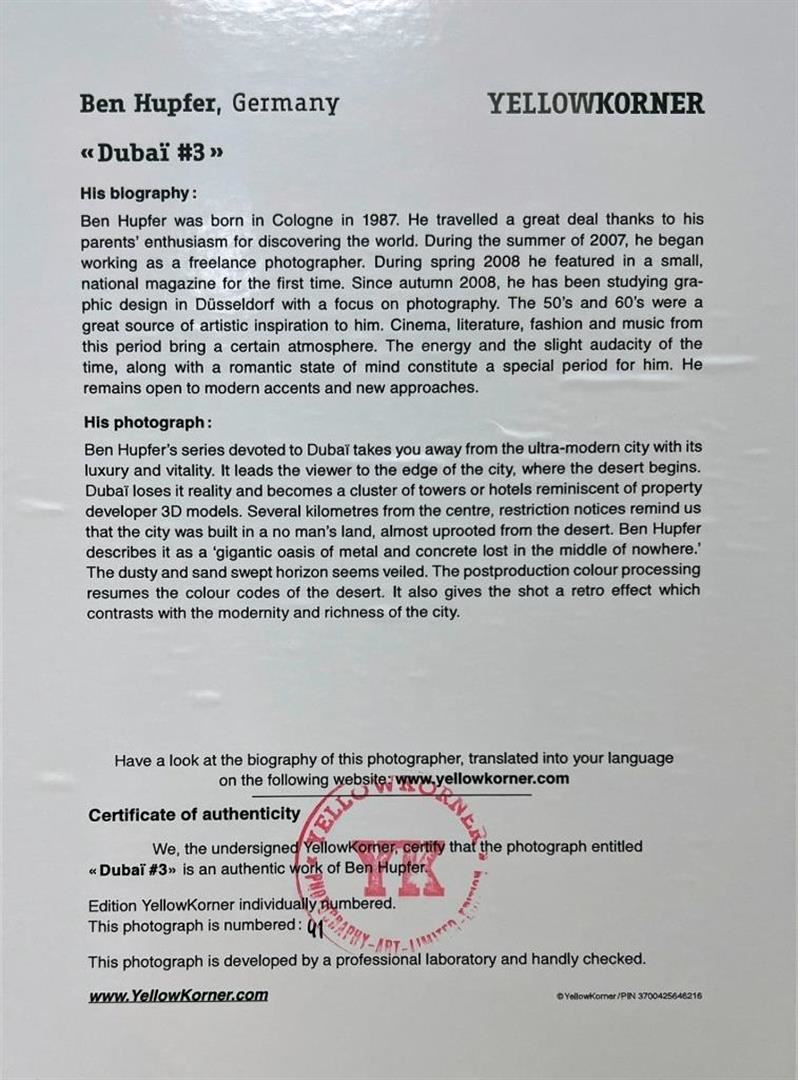 Ben Hupfer Germany Dubai #3 YellowKorner Certified Photograph. Certificate of Authenticity from YellowKorner affixed to the back. Matted Dimensions 16"x20". Protected with Clear Mylar Sleeve.