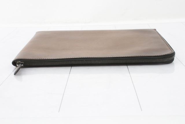 One Berluti Brown Venetian Leather Calligraphy Nino GM Document Case. Item is sold AS-IS. All available information is listed in the description and shown in the photo. Berluti Calligraphy Nino GM document bag features brown Venetian leather with calligraphy in white, gun-metal hardware, zip-around closure with brown leather zipper puller, black canvas and leather lining, six card slots and two slip pocket. 29.5cm x 21cm x 1.5cm