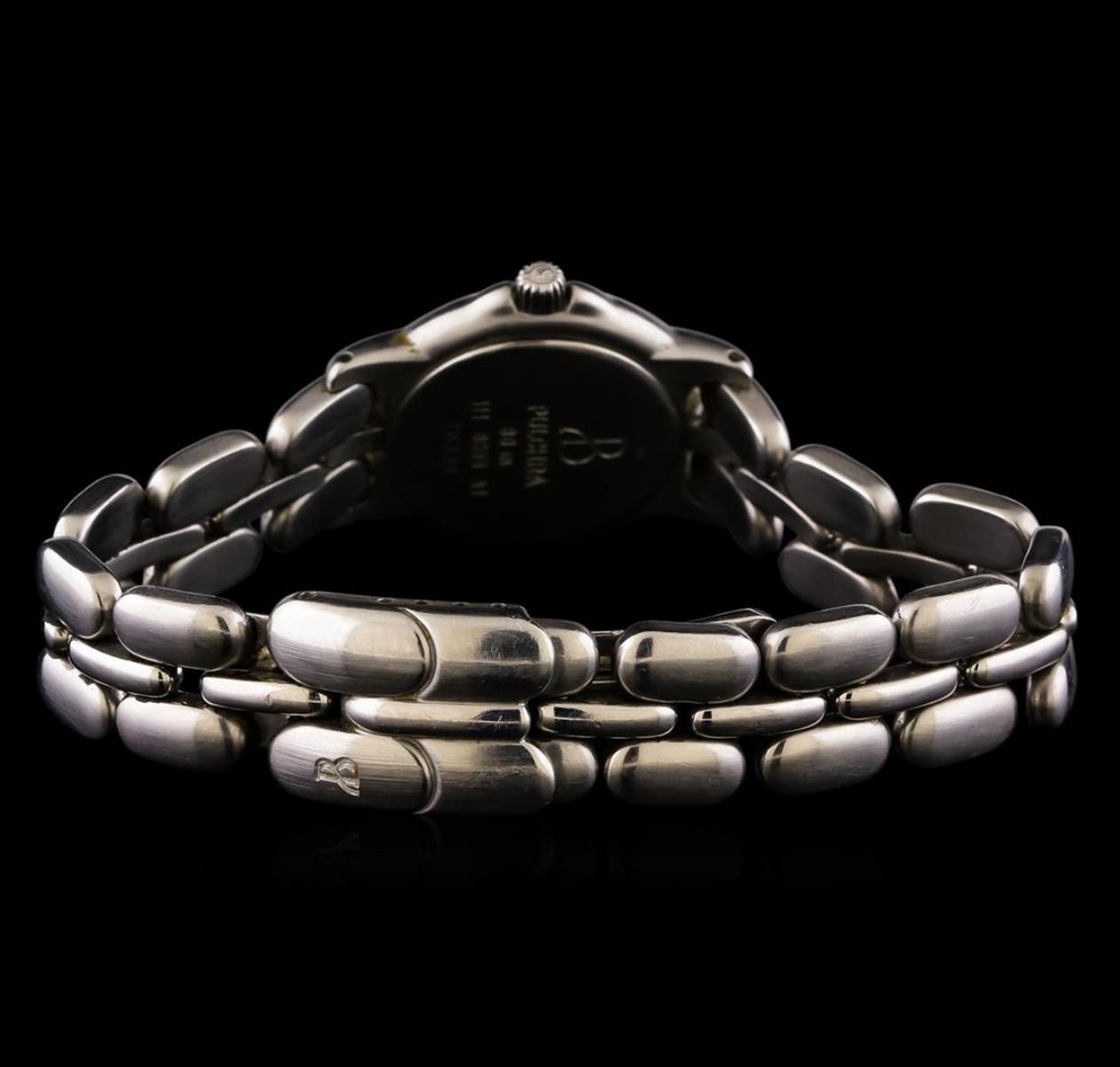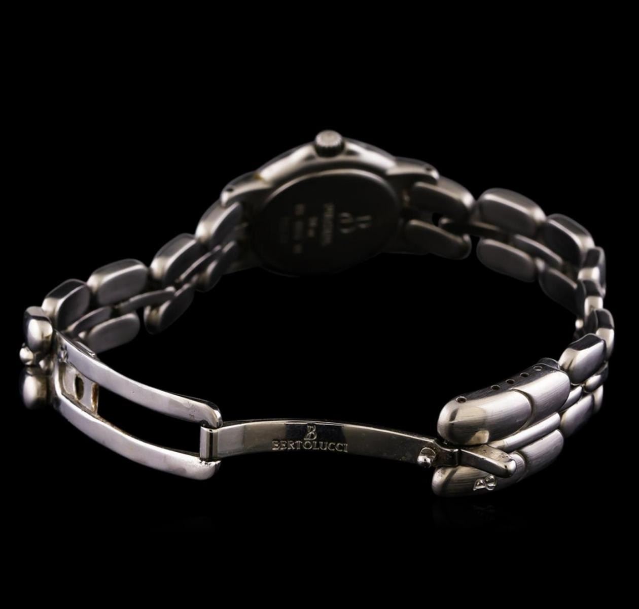 One Bertolucci Pulchra ladies watch featuring: Case: Stainless steel. Bezel: Stainless steel. Dial: White color; luminous silver-tone hour and minute hands; silver-tone hour markers. Date window located at the 3 o'clock position. Bracelet: Stainless steel. Condition: Barely noticeable surface scratches on bracelet and clasp, but otherwise there are no major signs of wear.