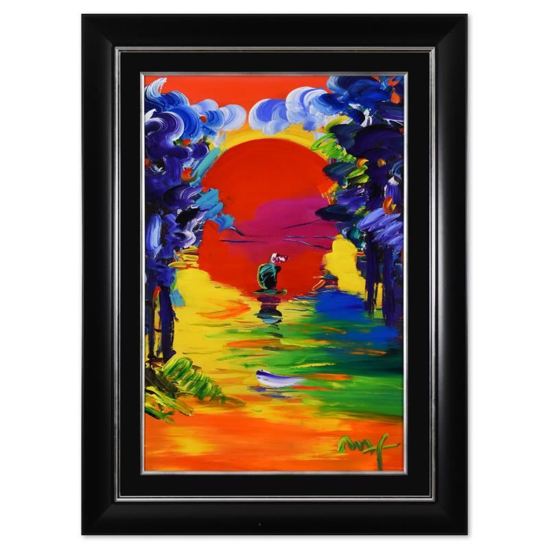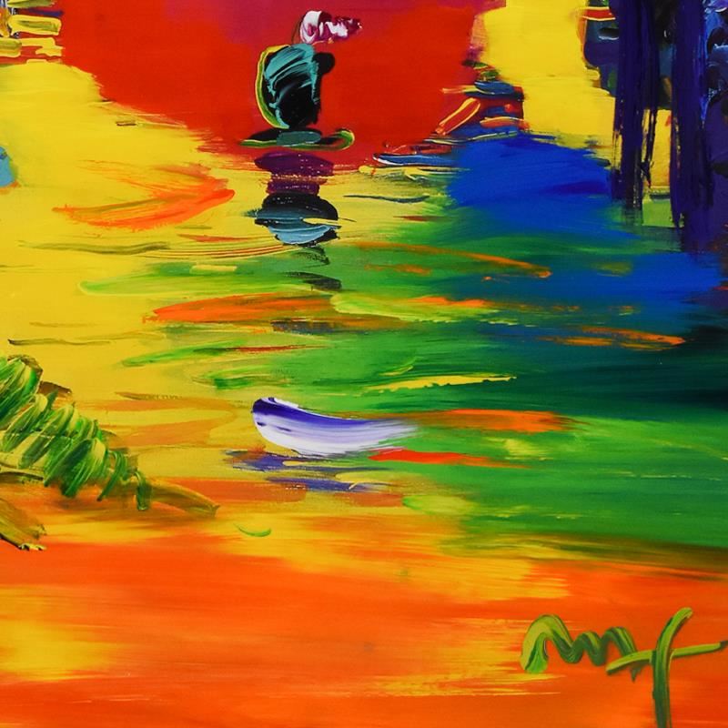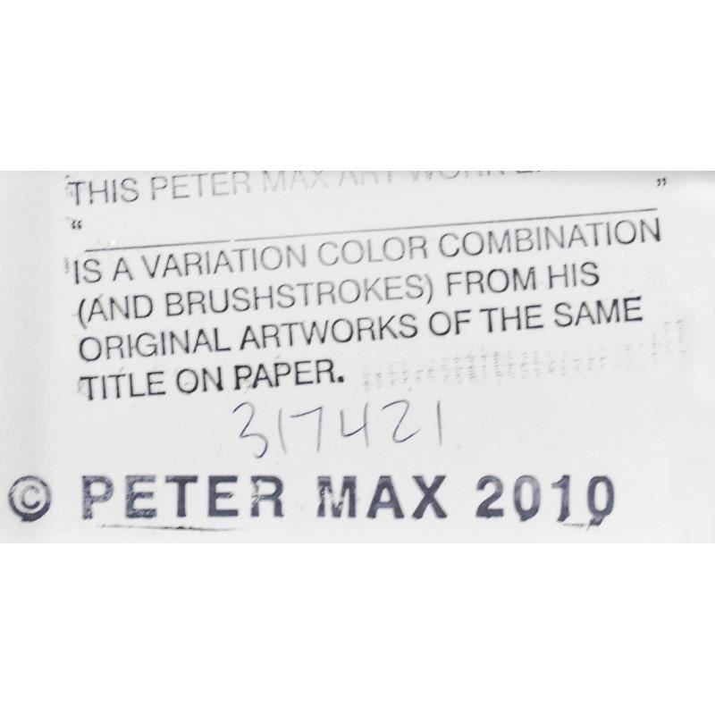 "Better World" is a one-of-a-kind acrylic mixed media on paper, hand signed by Peter Max. This piece comes custom framed. Includes Letter of Authenticity from Peter Max Studios and bears registration number inverso (317421). Measures approx. 34.5" x 46.5"